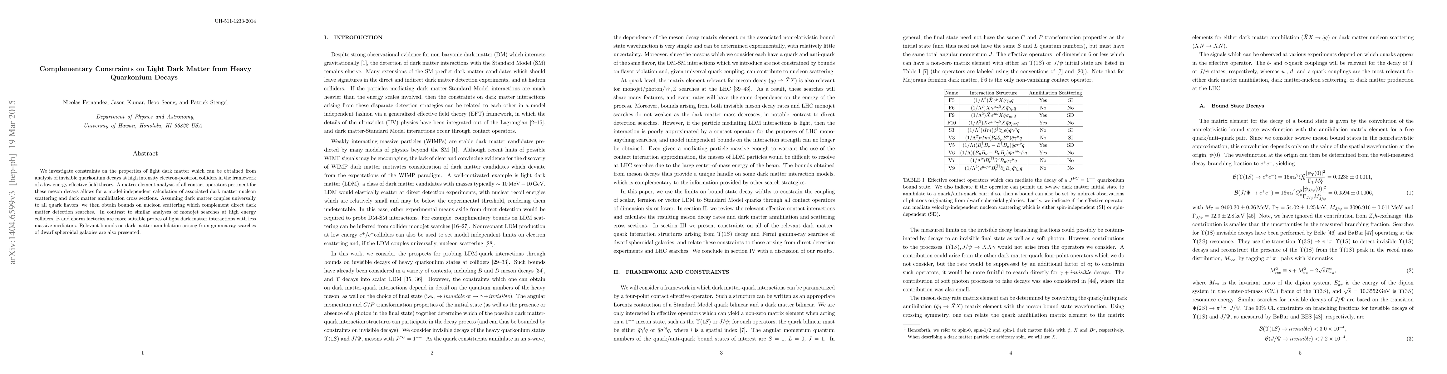 This paper derives complementary constraints on light dark matter from invisible quarkonium decays in electron-positron colliders using effective field theory, providing bounds on dark matter-nucleon scattering that complement direct detection methods. It also discusses the advantages of B and charm factories over high-energy colliders in probing light dark matter, and includes limits from gamma-ray searches in dwarf galaxies.