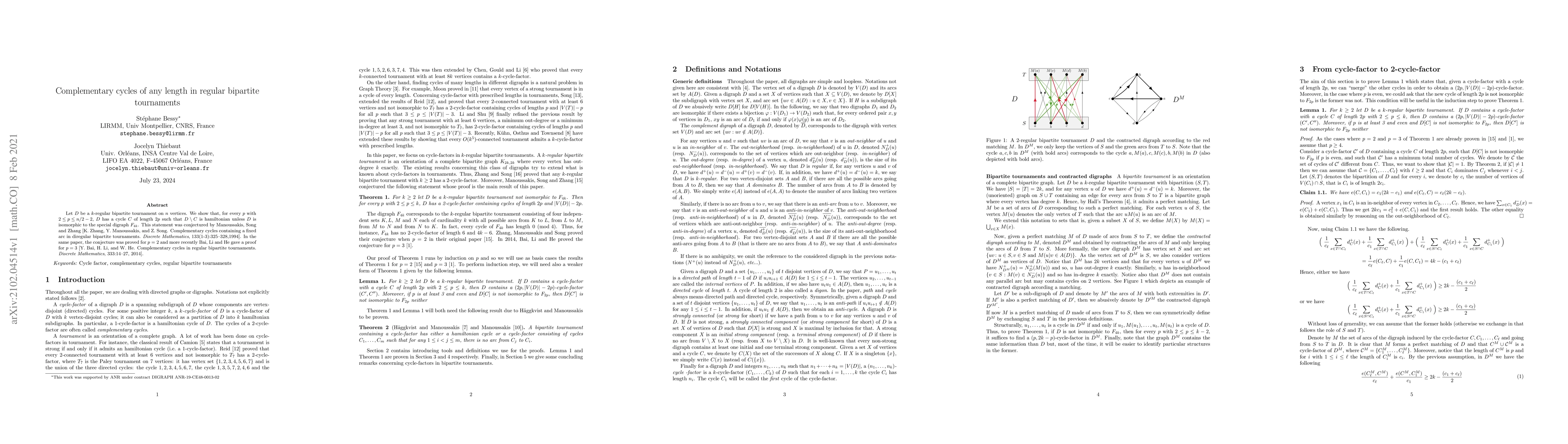 This paper proves that a $k$-regular bipartite tournament on $n$ vertices contains a $2p$-length cycle $C$ for every $2 \le p \le n/2-2$ such that the remaining graph is Hamiltonian, unless it is isomorphic to a specific digraph $F_{4k}$. This confirms a conjecture by Manoussakis, Song, and Zhang.