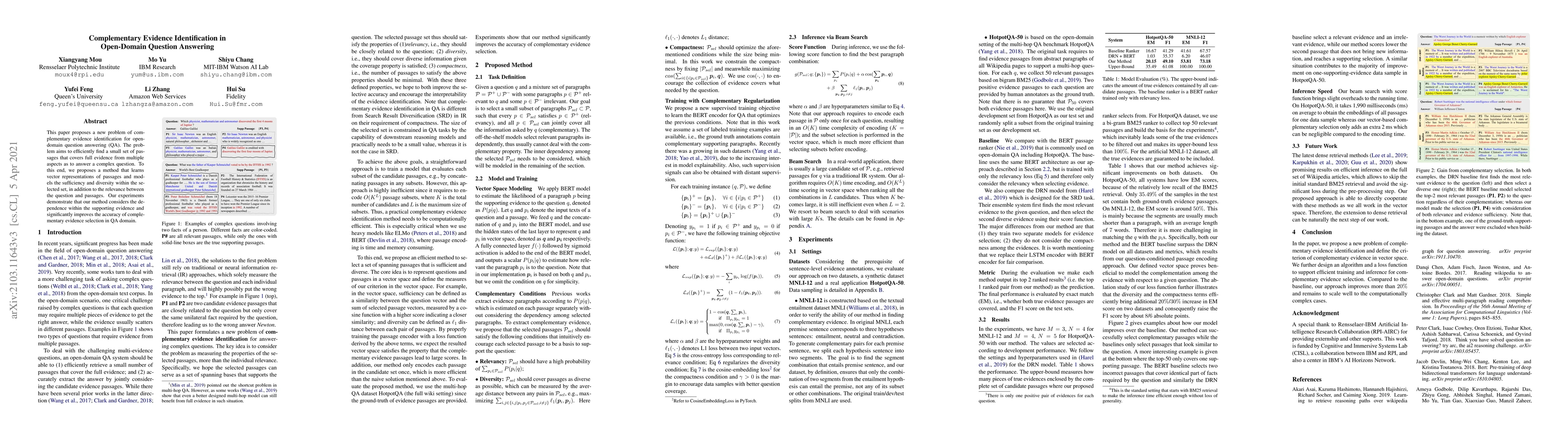 This paper proposes a new problem of complementary evidence identification for open-domain question answering (QA). The problem aims to efficiently find a small set of passages that covers full evidence from multiple aspects as to answer a complex question. To this end, we proposes a method that learns vector representations of passages and models the sufficiency and diversity within the selected set, in addition to the relevance between the question and passages. Our experiments demonstrate that our method considers the dependence within the supporting evidence and significantly improves the accuracy of complementary evidence selection in QA domain.