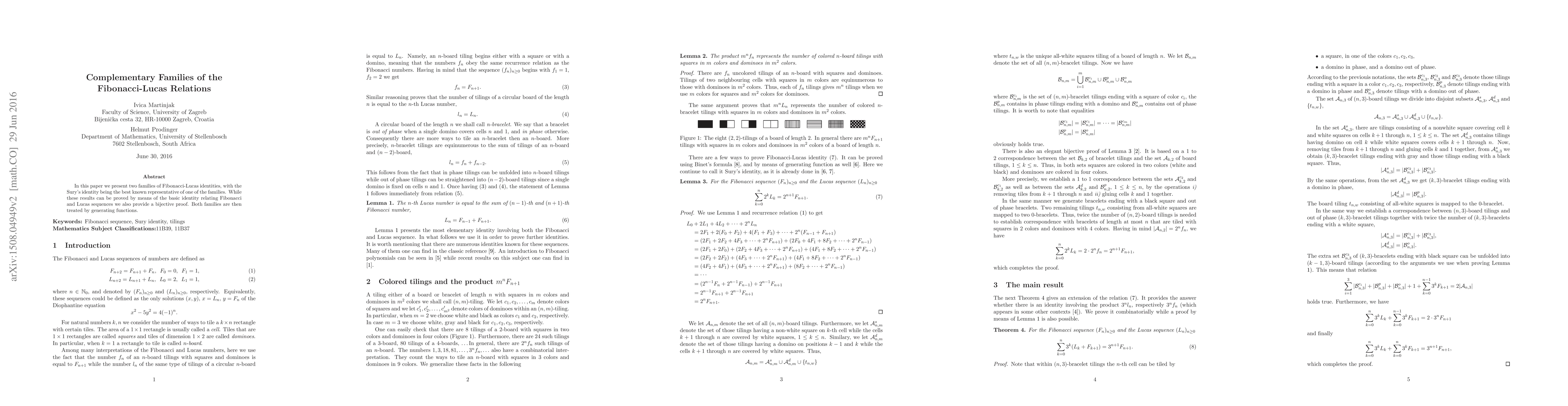 In this paper we present two families of Fibonacci-Lucas identities, with the Sury's identity being the best known representative of one of the families. While these results can be proved by means of the basic identity relating Fibonacci and Lucas sequences we also provide a bijective proof. Both families are then treated by generating functions.