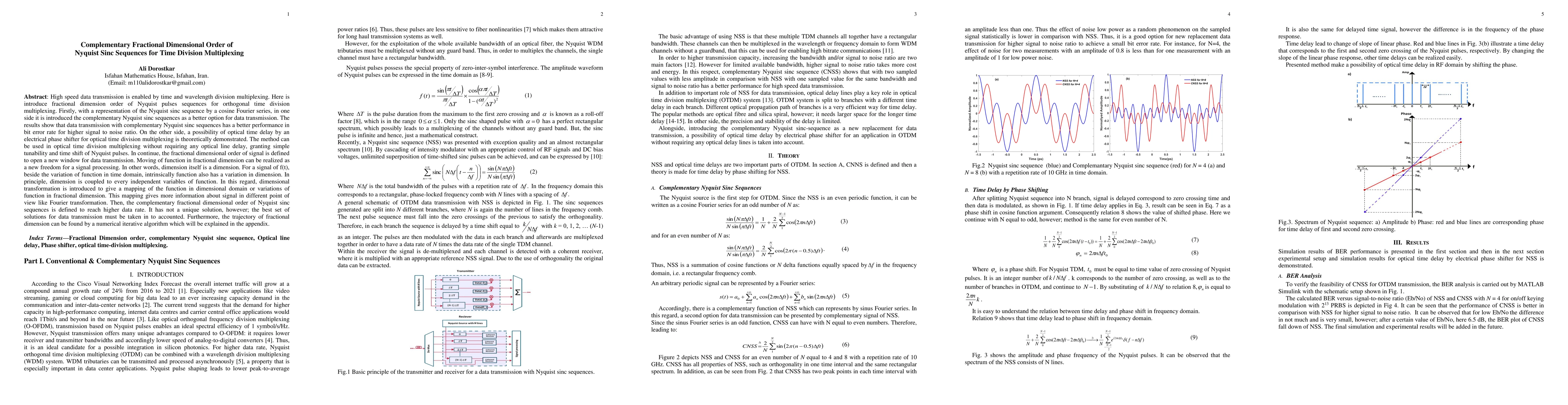 This paper introduces fractional dimensional order of Nyquist sinc sequences for orthogonal time division multiplexing, proposing complementary sequences for improved data transmission and a method for optical time delay using electrical phase shifters. The concept of fractional dimensional order and dimensional transformation is explored to enhance data rate, with a numerical algorithm provided for finding the trajectory of fractional dimension.