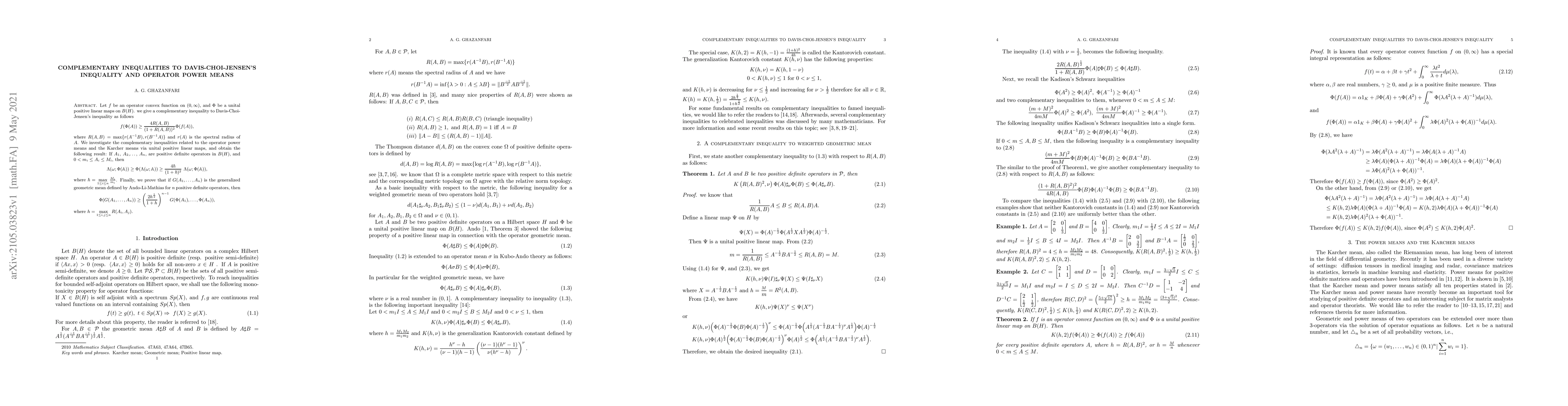 This paper presents complementary inequalities to Davis-Choi-Jensen's inequality, involving operator convex functions and unital positive linear maps on B(H). Key findings include inequalities relating to operator power means and Karcher means, with bounds established using spectral radii. The research also explores generalized geometric means, offering an inequality for their behavior under certain linear maps.
