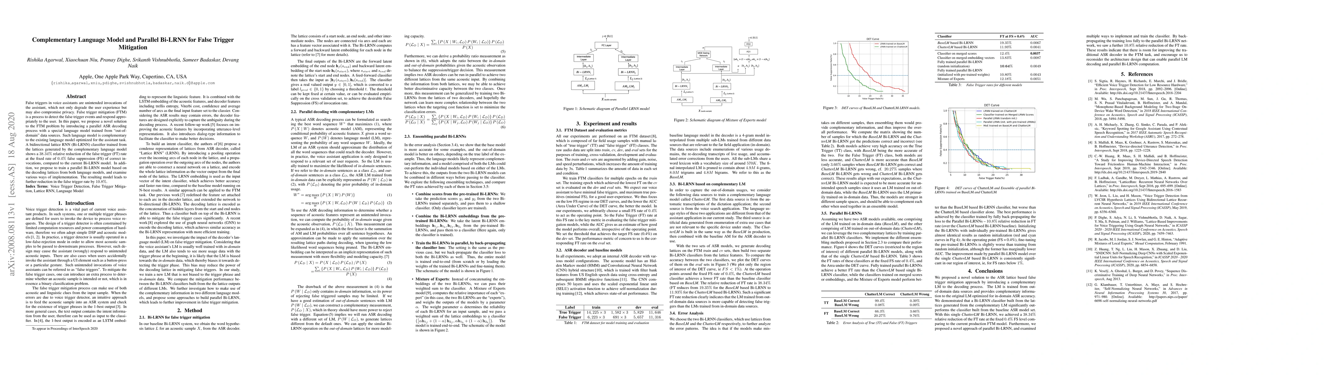This paper proposes a novel approach to mitigate false triggers in voice assistants using a complementary language model and parallel Bi-LRNN classifier. The method achieves a 38.34% reduction in false triggers with minimal impact on correct invocations, and further improvements by 10.8% through a parallel Bi-LRNN model.