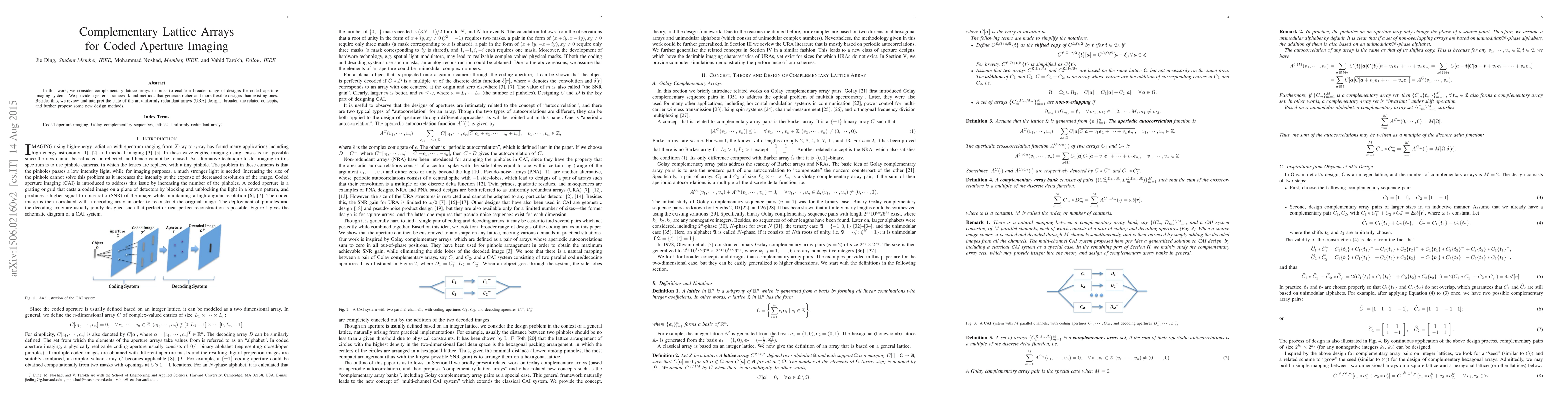 This paper introduces complementary lattice arrays to enhance coded aperture imaging systems, offering a new framework for generating flexible and richer designs compared to existing uniformly redundant arrays (URA). It also reviews current URA designs, expands on related concepts, and proposes novel design methods.