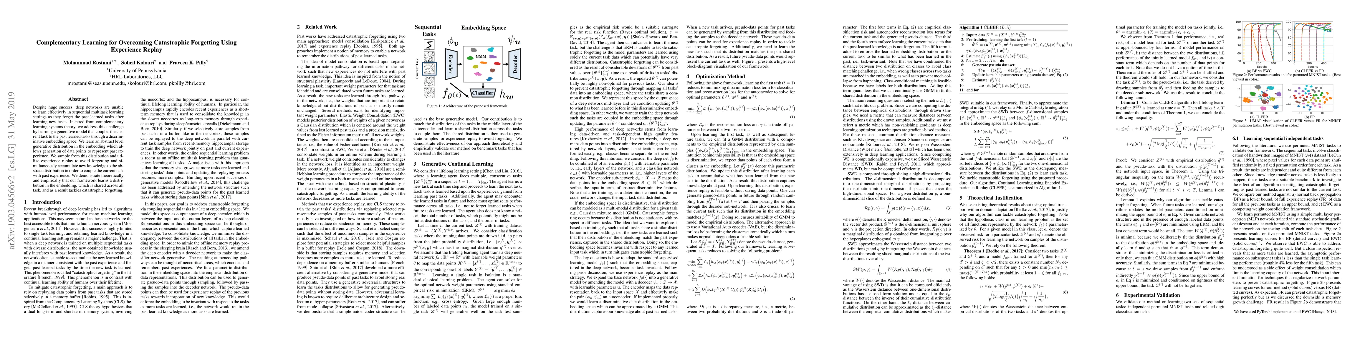 Despite huge success, deep networks are unable to learn effectively in sequential multitask learning settings as they forget the past learned tasks after learning new tasks. Inspired from complementary learning systems theory, we address this challenge by learning a generative model that couples the current task to the past learned tasks through a discriminative embedding space. We learn an abstract level generative distribution in the embedding that allows the generation of data points to represent the experience. We sample from this distribution and utilize experience replay to avoid forgetting and simultaneously accumulate new knowledge to the abstract distribution in order to couple the current task with past experience. We demonstrate theoretically and empirically that our framework learns a distribution in the embedding that is shared across all task and as a result tackles catastrophic forgetting.