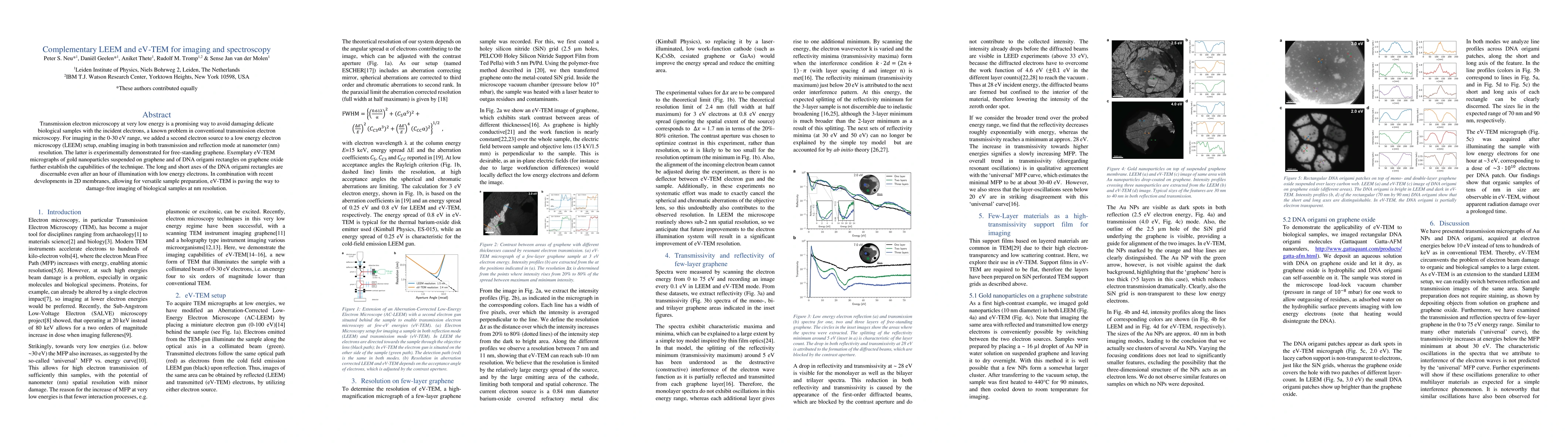 Researchers developed a new technique combining low-energy electron microscopy (LEEM) and electron-vibration TEM for non-destructive imaging of biological samples at nanometer resolution. This method enables damage-free imaging and spectroscopy of delicate samples like DNA origami rectangles on graphene oxide.