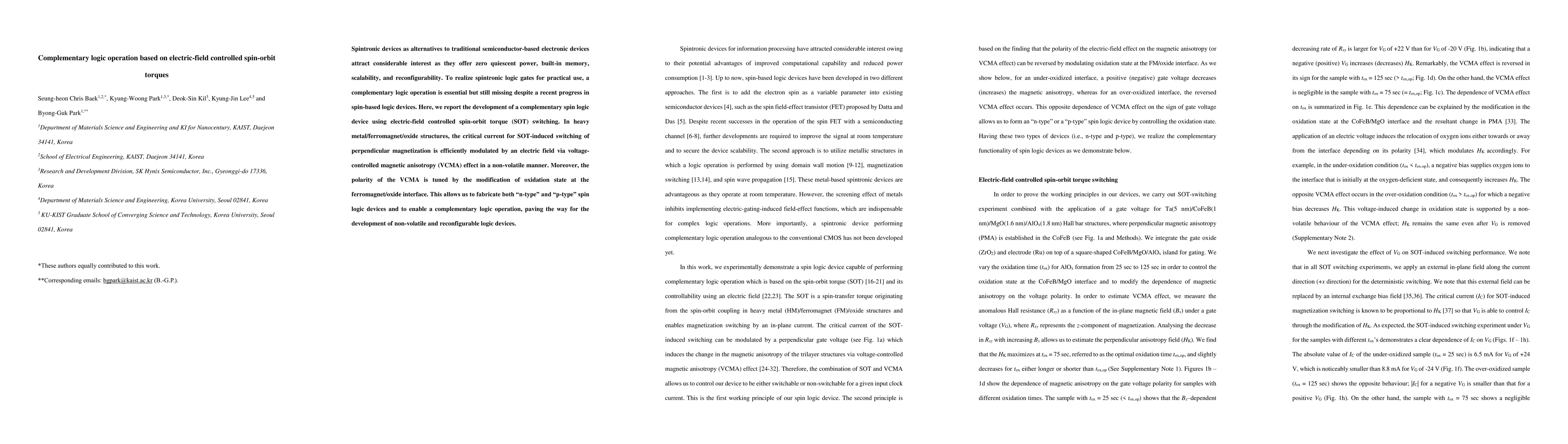 This paper presents a complementary spin logic device utilizing electric-field controlled spin-orbit torques, enabling efficient modulation of switching current via voltage-controlled magnetic anisotropy. The study demonstrates the fabrication of both n-type and p-type devices, achieving a complementary logic operation for non-volatile and reconfigurable spintronic logic gates.