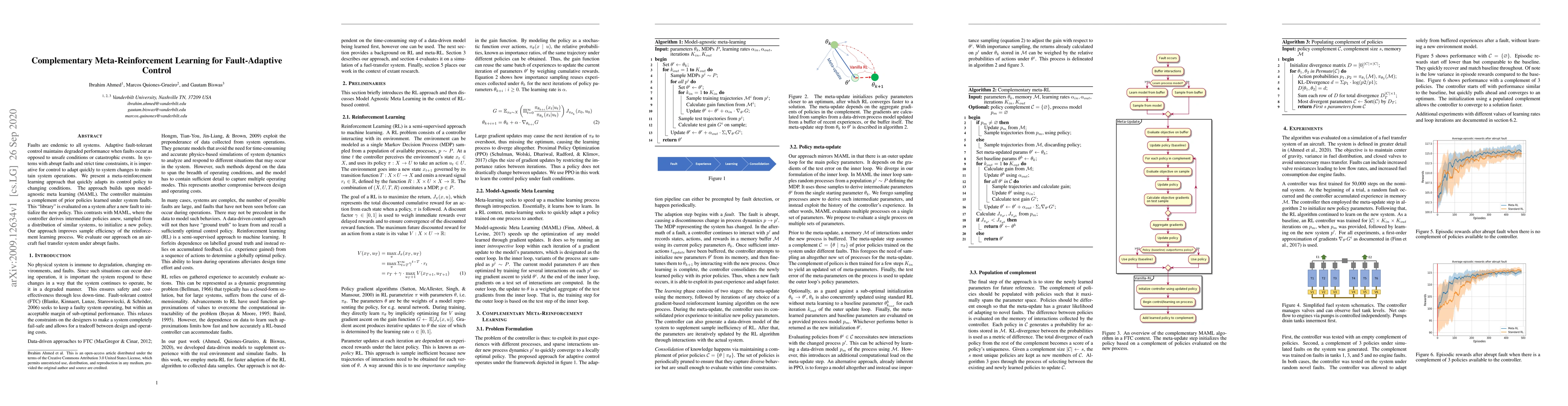 Faults are endemic to all systems. Adaptive fault-tolerant control maintains degraded performance when faults occur as opposed to unsafe conditions or catastrophic events. In systems with abrupt faults and strict time constraints, it is imperative for control to adapt quickly to system changes to maintain system operations. We present a meta-reinforcement learning approach that quickly adapts its control policy to changing conditions. The approach builds upon model-agnostic meta learning (MAML). The controller maintains a complement of prior policies learned under system faults. This "library" is evaluated on a system after a new fault to initialize the new policy. This contrasts with MAML, where the controller derives intermediate policies anew, sampled from a distribution of similar systems, to initialize a new policy. Our approach improves sample efficiency of the reinforcement learning process. We evaluate our approach on an aircraft fuel transfer system under abrupt faults.