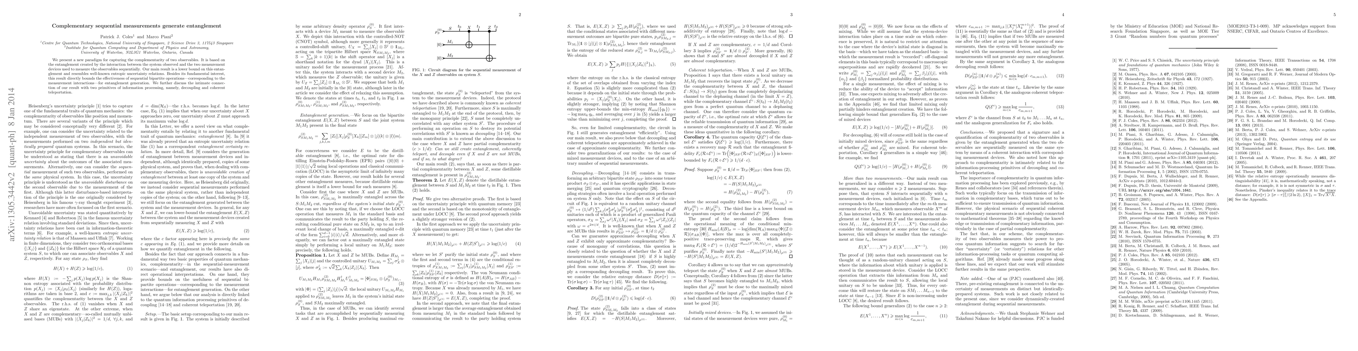 We present a new paradigm for capturing the complementarity of two observables. It is based on the entanglement created by the interaction between the system observed and the two measurement devices used to measure the observables sequentially. Our main result is a lower bound on this entanglement and resembles well-known entropic uncertainty relations. Besides its fundamental interest, this result directly bounds the effectiveness of sequential bipartite operations---corresponding to the measurement interactions---for entanglement generation. We further discuss the intimate connection of our result with two primitives of information processing, namely, decoupling and coherent teleportation.