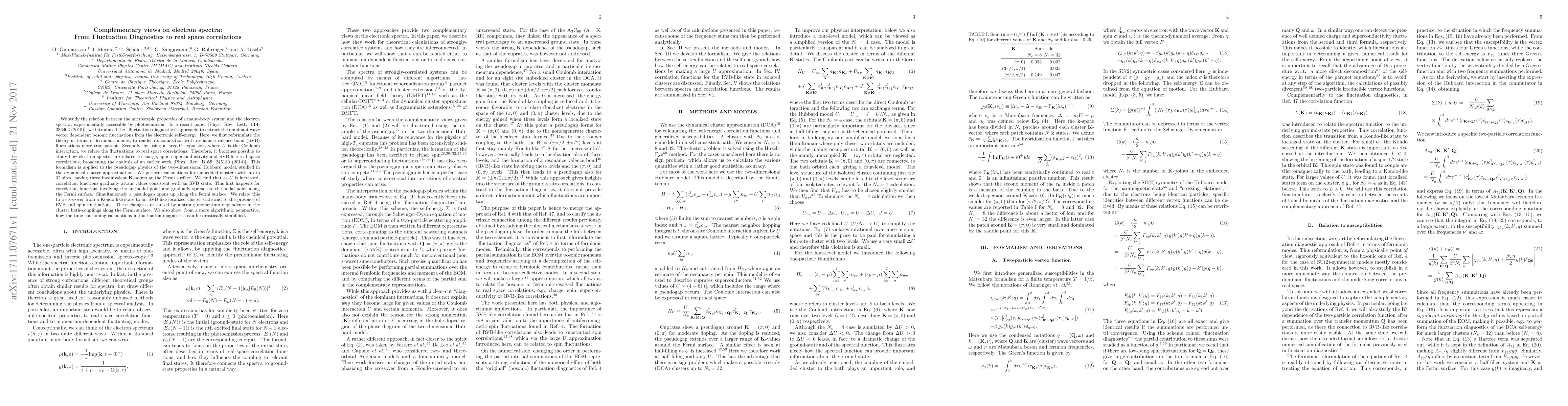 We study the relation between the microscopic properties of a many-body system and the electron spectra, experimentally accessible by photoemission. In a recent paper [Phys. Rev. Lett. 114, 236402 (2015)], we introduced the "fluctuation diagnostics" approach, to extract the dominant wave vector dependent bosonic fluctuations from the electronic self-energy. Here, we first reformulate the theory in terms of fermionic modes, to render its connection with resonance valence bond (RVB) fluctuations more transparent. Secondly, by using a large-U expansion, where U is the Coulomb interaction, we relate the fluctuations to real space correlations. Therefore, it becomes possible to study how electron spectra are related to charge, spin, superconductivity and RVB-like real space correlations, broadening the analysis of an earlier work [Phys. Rev. B 89, 245130 (2014)]. This formalism is applied to the pseudogap physics of the two-dimensional Hubbard model, studied in the dynamical cluster approximation. We perform calculations for embedded clusters with up to 32 sites, having three inequivalent K-points at the Fermi surface. We find that as U is increased, correlation functions gradually attain values consistent with an RVB state. This first happens for correlation functions involving the antinodal point and gradually spreads to the nodal point along the Fermi surface. Simultaneously a pseudogap opens up along the Fermi surface. We relate this to a crossover from a Kondo-like state to an RVB-like localized cluster state and to the presence of RVB and spin fluctuations. These changes are caused by a strong momentum dependence in the cluster bath-couplings along the Fermi surface. We also show, from a more algorithmic perspective, how the time-consuming calculations in fluctuation diagnostics can be drastically simplified.
