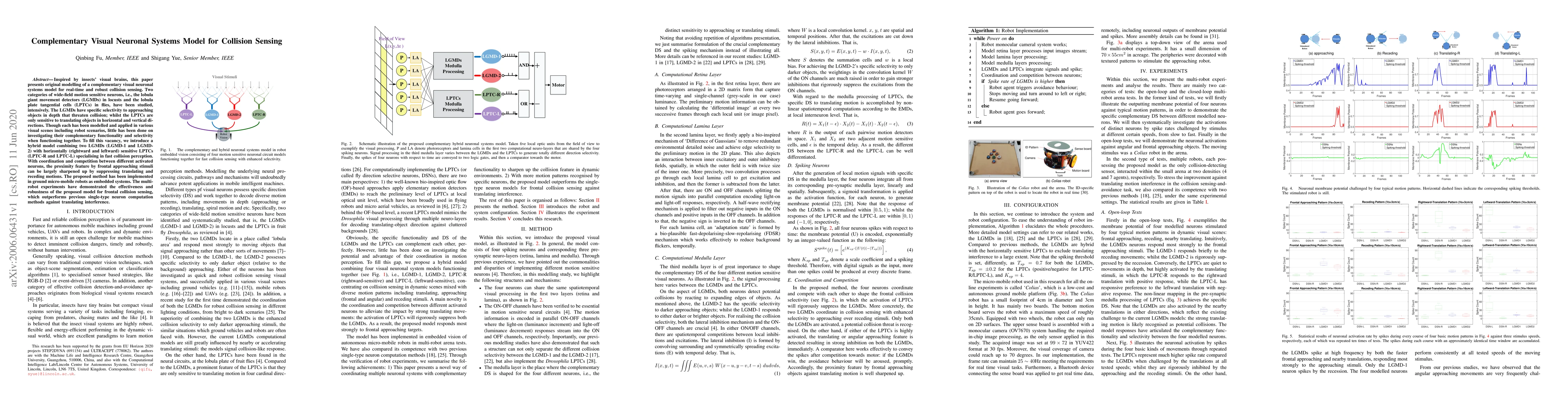 Inspired by insects' visual brains, this paper presents original modelling of a complementary visual neuronal systems model for real-time and robust collision sensing. Two categories of wide-field motion sensitive neurons, i.e., the lobula giant movement detectors (LGMDs) in locusts and the lobula plate tangential cells (LPTCs) in flies, have been studied, intensively. The LGMDs have specific selectivity to approaching objects in depth that threaten collision; whilst the LPTCs are only sensitive to translating objects in horizontal and vertical directions. Though each has been modelled and applied in various visual scenes including robot scenarios, little has been done on investigating their complementary functionality and selectivity when functioning together. To fill this vacancy, we introduce a hybrid model combining two LGMDs (LGMD-1 and LGMD-2) with horizontally (rightward and leftward) sensitive LPTCs (LPTC-R and LPTC-L) specialising in fast collision perception. With coordination and competition between different activated neurons, the proximity feature by frontal approaching stimuli can be largely sharpened up by suppressing translating and receding motions. The proposed method has been implemented in ground micro-mobile robots as embedded systems. The multi-robot experiments have demonstrated the effectiveness and robustness of the proposed model for frontal collision sensing, which outperforms previous single-type neuron computation methods against translating interference.