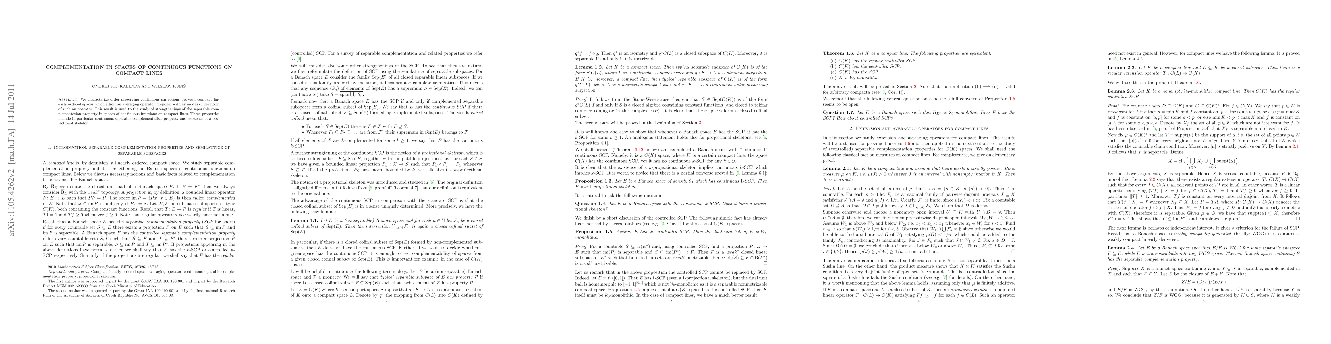 This paper studies complementation properties in spaces of continuous functions on compact lines, focusing on order-preserving surjections with averaging operators, and characterizing their norm.
