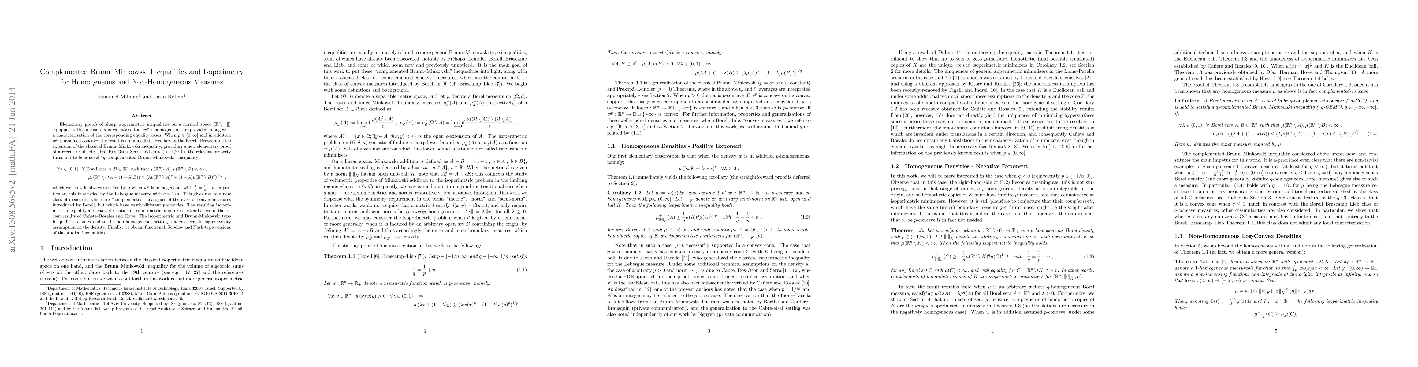 Elementary proofs of sharp isoperimetric inequalities on a normed space $(\mathbb{R}^n,||\cdot||)$ equipped with a measure $\mu = w(x) dx$ so that $w^p$ is homogeneous are provided, along with a characterization of the corresponding equality cases. When $p \in (0,\infty]$ and in addition $w^p$ is assumed concave, the result is an immediate corollary of the Borell-Brascamp-Lieb extension of the classical Brunn-Minkowski inequality, providing an elementary proof of a recent result of Cabr\'e-Ros Oton-Serra. When $p \in (-1/n,0)$, the relevant property turns out to be a novel "complemented Brunn-Minkowski" inequality, which we show is always satisfied by $\mu$ when $w^p$ is homogeneous. This gives rise to a new class of measures, which are "complemented" analogues of the class of convex measures introduced by Borell, but which have vastly different properties. The resulting isoperimetric inequality and characterization of isoperimetric minimizers extends beyond the recent results of Ca\~{n}ete--Rosales and Howe. The isoperimetric and Brunn-Minkowski type inequalities extend to the non-homogeneous setting, under a certain log-convexity assumption on the density. Finally, we obtain functional, Sobolev and Nash-type versions of the studied inequalities.