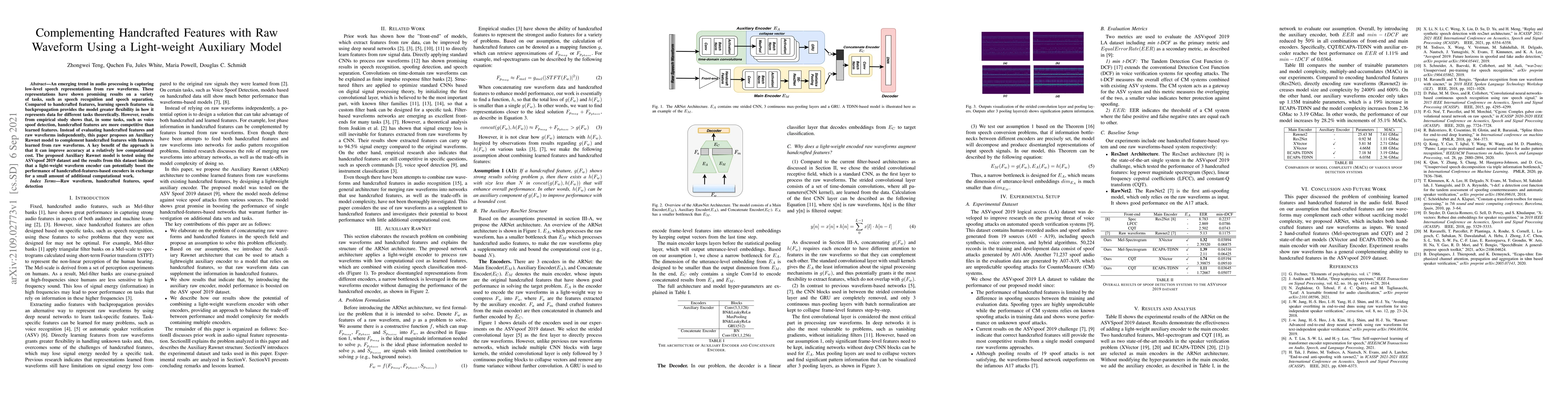 This paper proposes an Auxiliary Rawnet model to enhance handcrafted features with learned features from raw waveforms, achieving improved accuracy in tasks like voice spoof detection with minimal computational overhead. The model's effectiveness is demonstrated through experiments on the ASVspoof 2019 dataset, showing that a lightweight waveform encoder can augment handcrafted-features-based encoders.