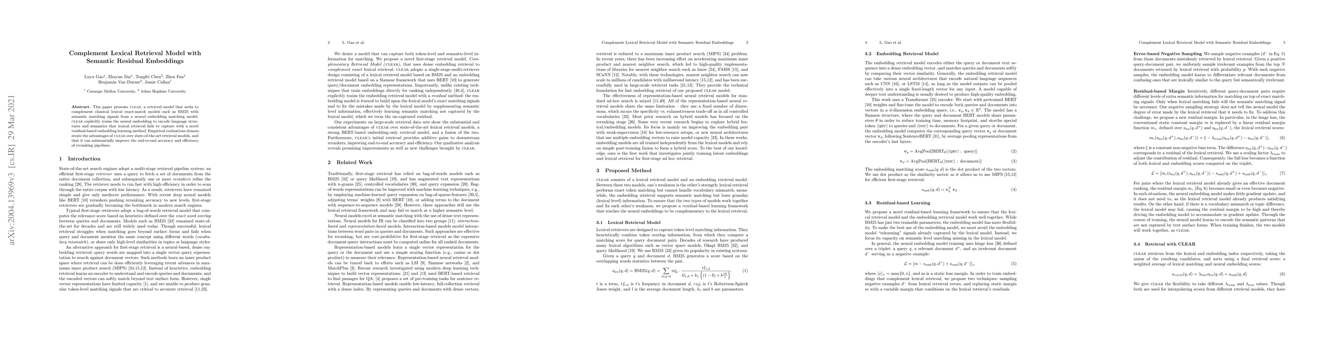 This paper presents CLEAR, a retrieval model that seeks to complement classical lexical exact-match models such as BM25 with semantic matching signals from a neural embedding matching model. CLEAR explicitly trains the neural embedding to encode language structures and semantics that lexical retrieval fails to capture with a novel residual-based embedding learning method. Empirical evaluations demonstrate the advantages of CLEAR over state-of-the-art retrieval models, and that it can substantially improve the end-to-end accuracy and efficiency of reranking pipelines.