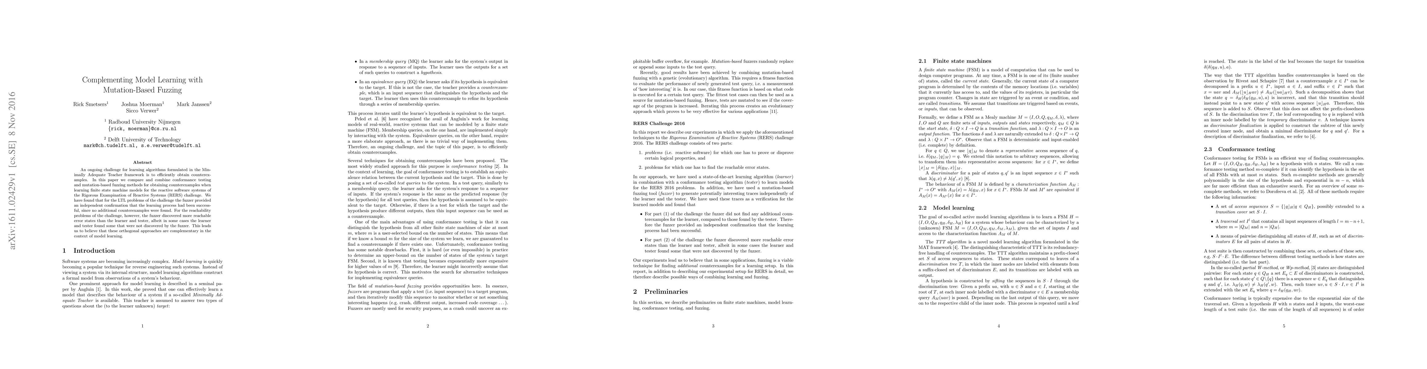 An ongoing challenge for learning algorithms formulated in the Minimally Adequate Teacher framework is to efficiently obtain counterexamples. In this paper we compare and combine conformance testing and mutation-based fuzzing methods for obtaining counterexamples when learning finite state machine models for the reactive software systems of the Rigorous Exampination of Reactive Systems (RERS) challenge. We have found that for the LTL problems of the challenge the fuzzer provided an independent confirmation that the learning process had been successful, since no additional counterexamples were found. For the reachability problems of the challenge, however, the fuzzer discovered more reachable error states than the learner and tester, albeit in some cases the learner and tester found some that were not discovered by the fuzzer. This leads us to believe that these orthogonal approaches are complementary in the context of model learning.