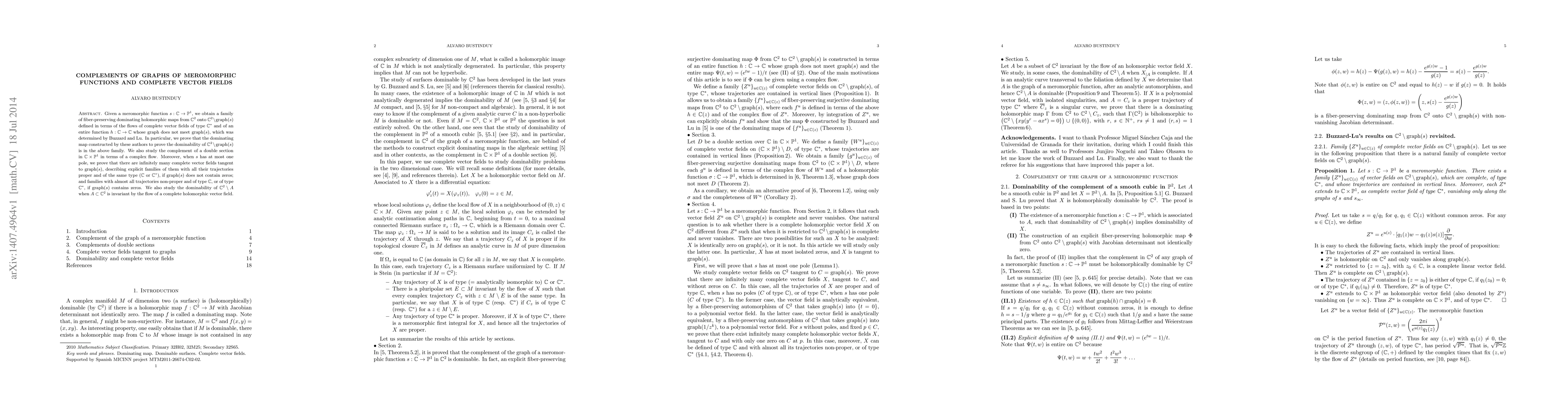 This research paper explores the complements of graphs of meromorphic functions in complex spaces, revealing families of dominating holomorphic maps and complete vector fields that preserve fiber structure.