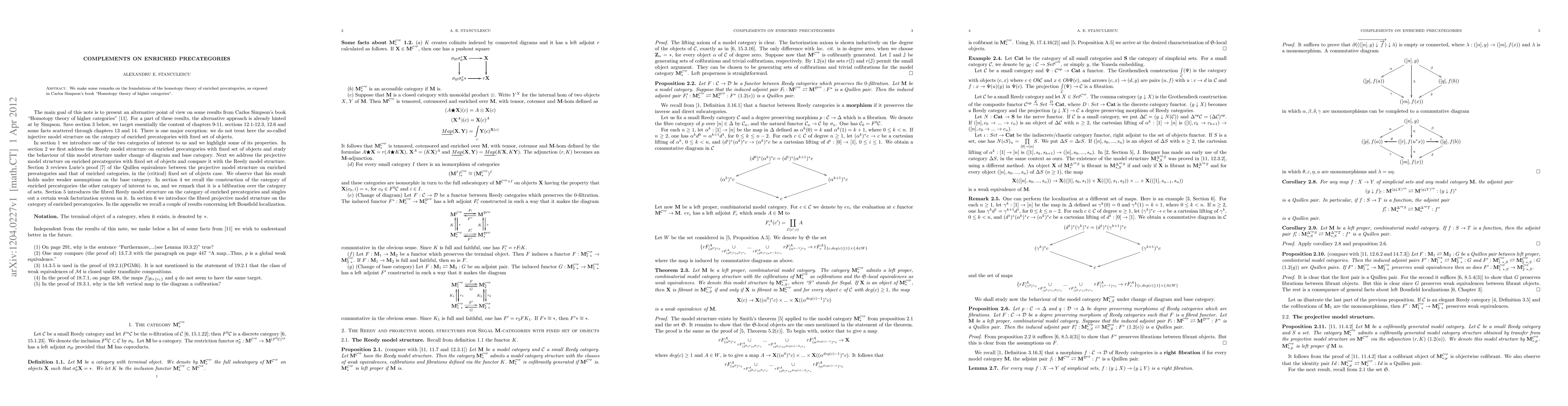 Summary: This paper discusses foundational aspects of homotopy theory within the context of enriched precategories, providing insights based on Carlos Simpson's work on higher categories. It aims to clarify the structure and properties relevant to this mathematical framework.