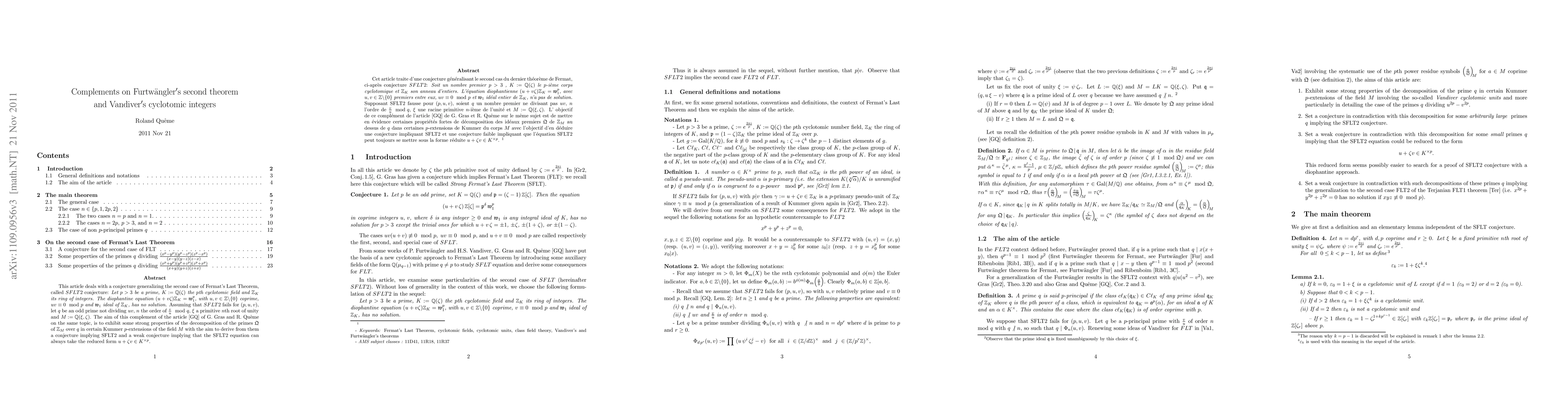 This article deals with a conjecture generalizing the second case of Fermat's Last Theorem, called $SFLT2$ conjecture: {\it Let $p>3$ be a prime, $K:=\Q(\zeta)$ the $p$th cyclotomic field and $\Z_K$ its ring of integers. The diophantine equation $(u+v\zeta)\Z_K=\mk w_1^p$, with $u,v\in\Z\backslash\{0\}$ coprime, $uv\equiv 0 \bmod p$ and $\mk w_1$ ideal of $\Z_K$, has no solution.} Assuming that $SFLT2$ fails for $(p,u,v)$, let $q$ be an odd prime not dividing $uv$, $n$ the order of $\frac{v}{u}\bmod q$, $\xi$ a primitive $n$th root of unity and $M:=\Q(\xi,\zeta)$. The aim of this complement of the article [GQ] of G. Gras and R. Qu\^eme on the same topic, is to exhibit some strong properties of the decomposition of the primes $\mk Q$ of $\Z_M$ over $q$ in certain Kummer $p$-extensions of the field $M$, to derive from them a weak conjecture which implies that the SFLT2 equation can always take the reduced form $u+\zeta v\in K^{\times p}$ and to set a conjecture implying SFLT2.