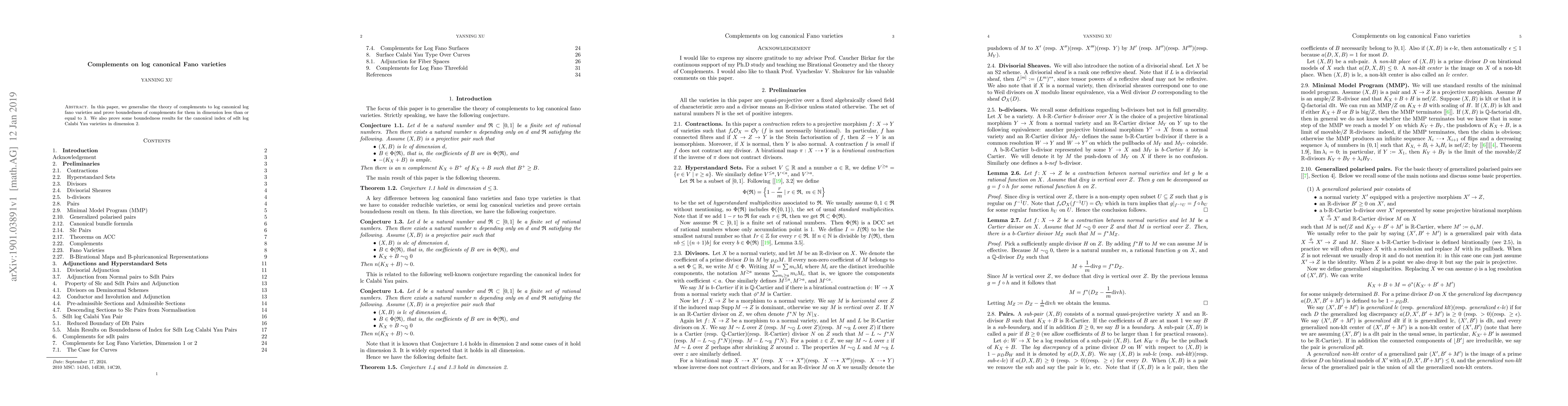 The paper generalizes the theory of complements to log canonical Fano varieties and proves boundedness for dimensions less than or equal to 3, also establishing boundedness results for the canonical index of sdlt log Calabi-Yau varieties in dimension 2.