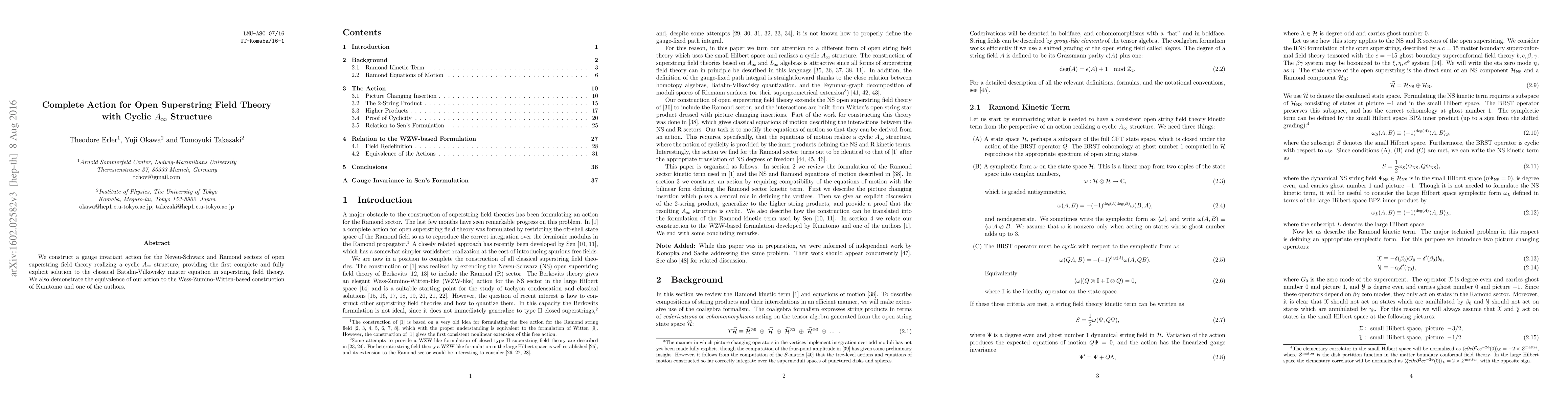 We construct a gauge invariant action for the Neveu-Schwarz and Ramond sectors of open superstring field theory realizing a cyclic $A_\infty$ structure, providing the first complete and fully explicit solution to the classical Batalin-Vilkovisky master equation in superstring field theory. We also demonstrate the equivalence of our action to the Wess-Zumino-Witten-based construction of Kunitomo and one of the authors.