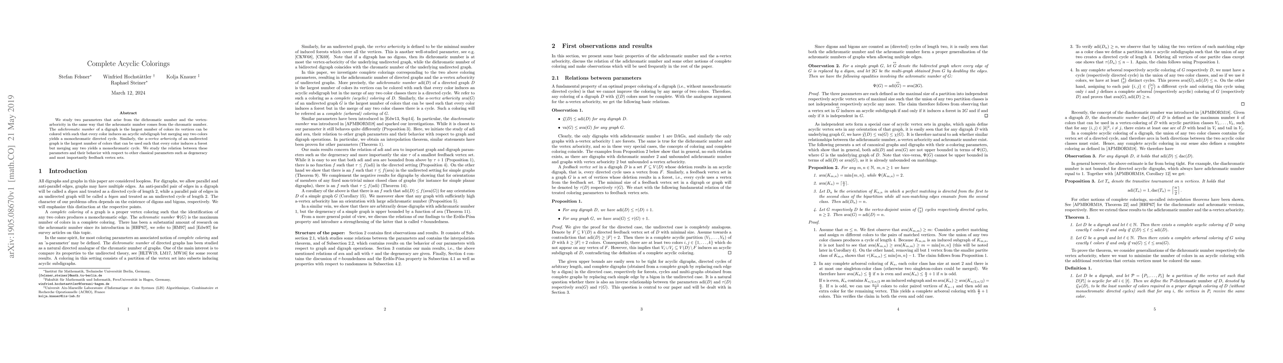 We study two parameters that arise from the dichromatic number and the vertex-arboricity in the same way that the achromatic number comes from the chromatic number. The adichromatic number of a digraph is the largest number of colors its vertices can be colored with such that every color induces an acyclic subdigraph but merging any two colors yields a monochromatic directed cycle. Similarly, the a-vertex arboricity of an undirected graph is the largest number of colors that can be used such that every color induces a forest but merging any two yields a monochromatic cycle. We study the relation between these parameters and their behavior with respect to other classical parameters such as degeneracy and most importantly feedback vertex sets.