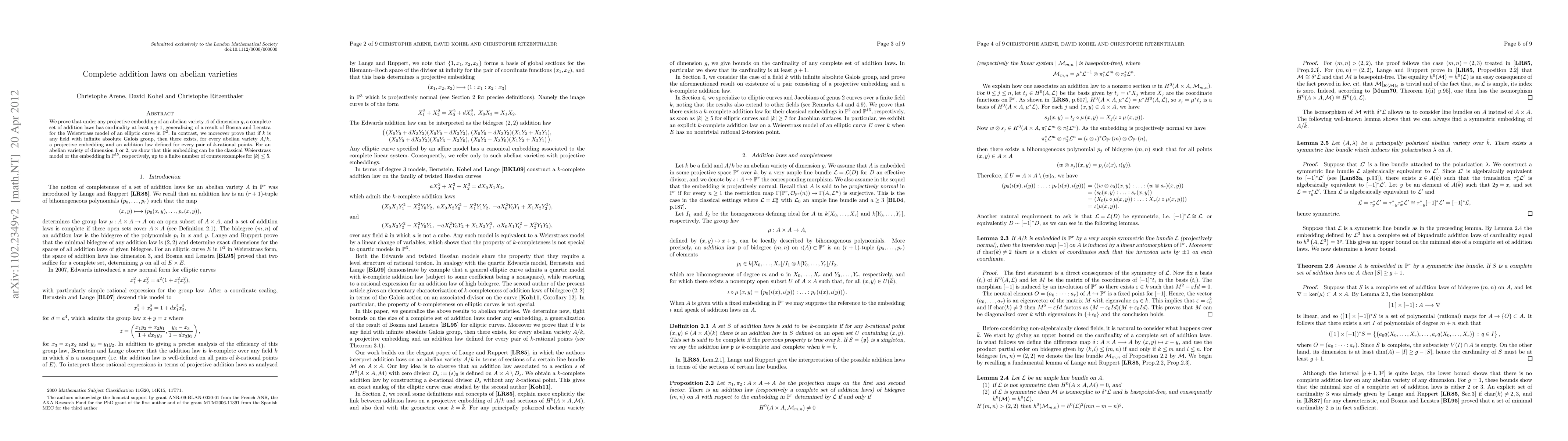 We prove that under any projective embedding of an abelian variety A of dimension g, a complete system of addition laws has cardinality at least g+1, generalizing of a result of Bosma and Lenstra for the Weierstrass model of an elliptic curve in P^2. In contrast with this geometric constraint, we moreover prove that if k is any field with infinite absolute Galois group, then there exists, for every abelian variety A/k, a projective embedding and an addition law defined for every pair of k-rational points. For an abelian variety of dimension 1 or 2, we show that this embedding can be the classical Weierstrass model or embedding in P^15, respectively, up to a finite number of counterexamples for |k| less or equal to 5.