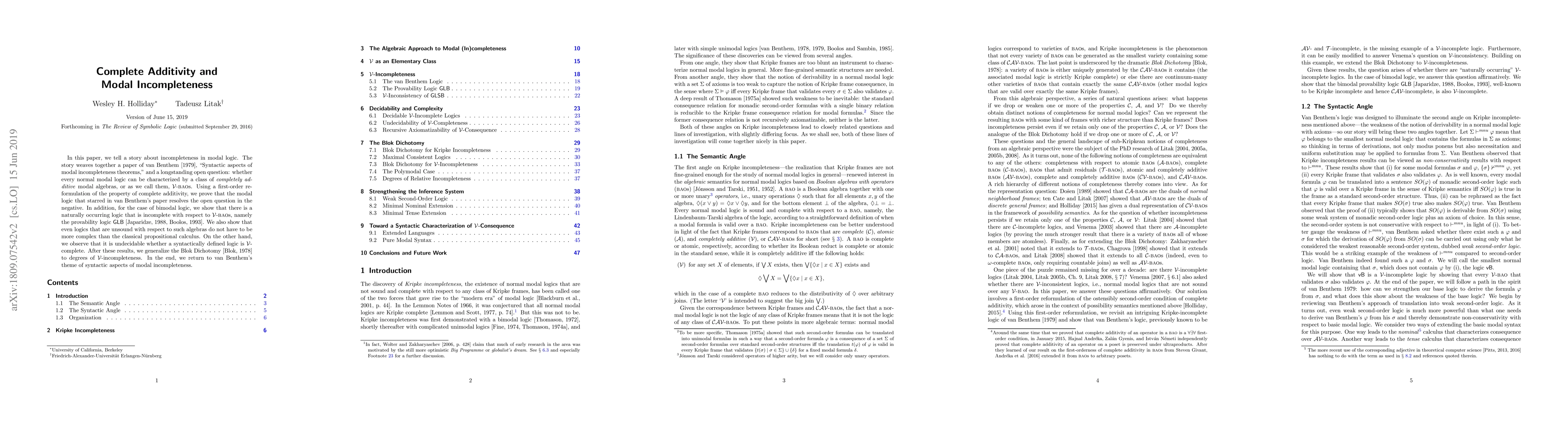 In this paper, we tell a story about incompleteness in modal logic. The story weaves together a paper of van Benthem, `Syntactic aspects of modal incompleteness theorems,' and a longstanding open question: whether every normal modal logic can be characterized by a class of completely additive modal algebras, or as we call them, V-BAOs. Using a first-order reformulation of the property of complete additivity, we prove that the modal logic that starred in van Benthem's paper resolves the open question in the negative. In addition, for the case of bimodal logic, we show that there is a naturally occurring logic that is incomplete with respect to V-BAOs, namely the provability logic GLB. We also show that even logics that are unsound with respect to such algebras do not have to be more complex than the classical propositional calculus. On the other hand, we observe that it is undecidable whether a syntactically defined logic is V-complete. After these results, we generalize the Blok Dichotomy to degrees of V-incompleteness. In the end, we return to van Benthem's theme of syntactic aspects of modal incompleteness.