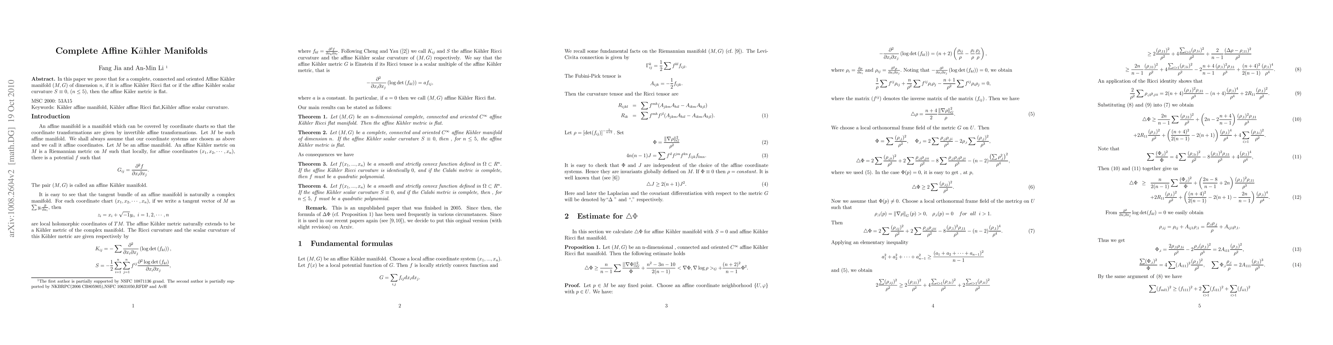 A complete, connected, and oriented C∞ affine K¨ahler manifold of dimension n is considered.