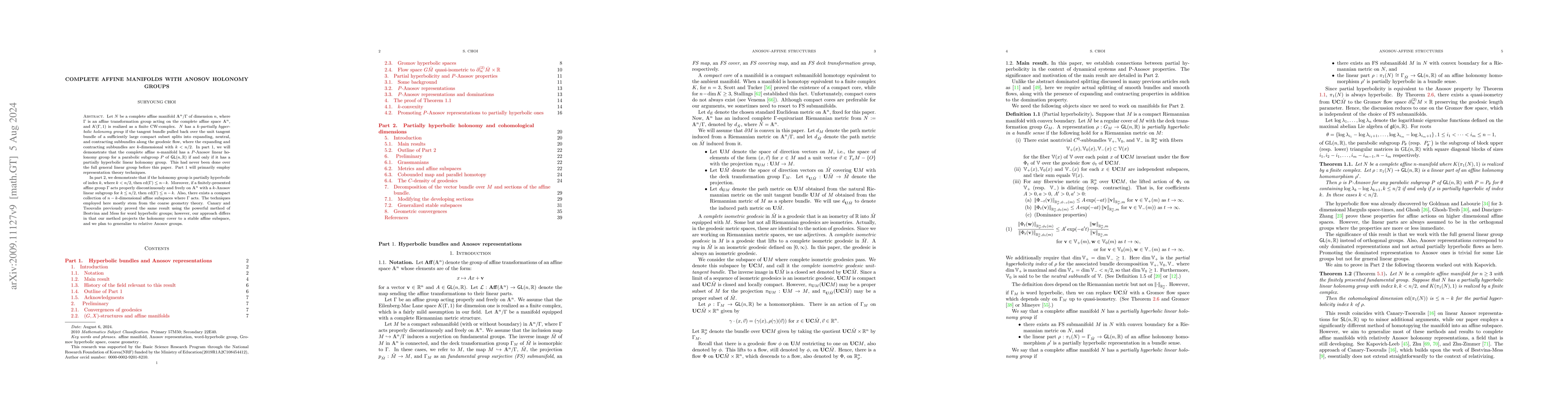 Let $N$ be a complete affine manifold $A^n/\Gamma$ of dimension $n$ where $\Gamma$ is an affine transformation group acting on the complete affine space $A^n$ and $K(\Gamma, 1)$ is realized as a finite CW-complex. $N$ has a $k$-partially hyperbolic holonomy group if the tangent bundle pulled over the unit tangent bundle over a sufficiently large compact part splits into expanding, neutral, and contracting subbundles along the geodesic flow where the expanding and contracting subbundles have the dimension $k$, $k< n/2$. In part 1, we will show that the complete affine $n$-manifold has a $P$-Anosov linear holonomy group for a parabolic subgroup $P$ of $\mathrm{GL}(n, \mathrm{R})$ if and only if it has a partially hyperbolic linear holonomy group. This was never been done over the full general linear group prior to this paper. The part 1 will be where the techniques are mostly representation theoretical. In part 2, we show that if the holonomy group is partially hyperbolic of index $k$, $k < n/2$, then $\mathrm{cd}(\Gamma) \leq n-k$. Moreover, if a finitely-presented affine group $\Gamma$ acts on $A^n$ properly discontinuously and freely with the $k$-Anosov linear group for $k \leq n/2$, then $\mathrm{cd}(\Gamma) \leq n-k$. Also, there exists a compact collection of $n-k$-dimensional affine subspaces where $\Gamma$ acts on. The techniques here are mostly from coarse geometry. Canary and Tsouvalis proved the same result before using the powerful method of Bestvina and Mess for word hyperbolic groups; however, our techniques are different in that our method is to project the holonomy cover to a stable affine subspace, and we plan to generalize to relative Anosov groups.
