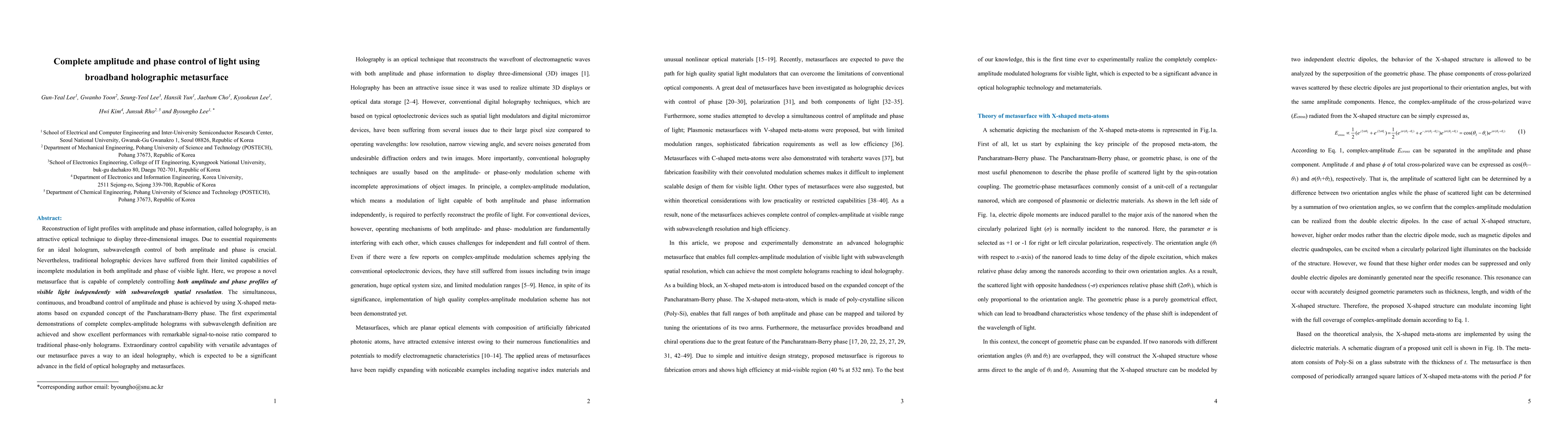 This paper proposes a novel broadband holographic metasurface using X-shaped meta-atoms to achieve complete control over both amplitude and phase profiles of visible light with subwavelength resolution. Experimental results demonstrate superior performance in complex-amplitude holography compared to traditional phase-only methods.