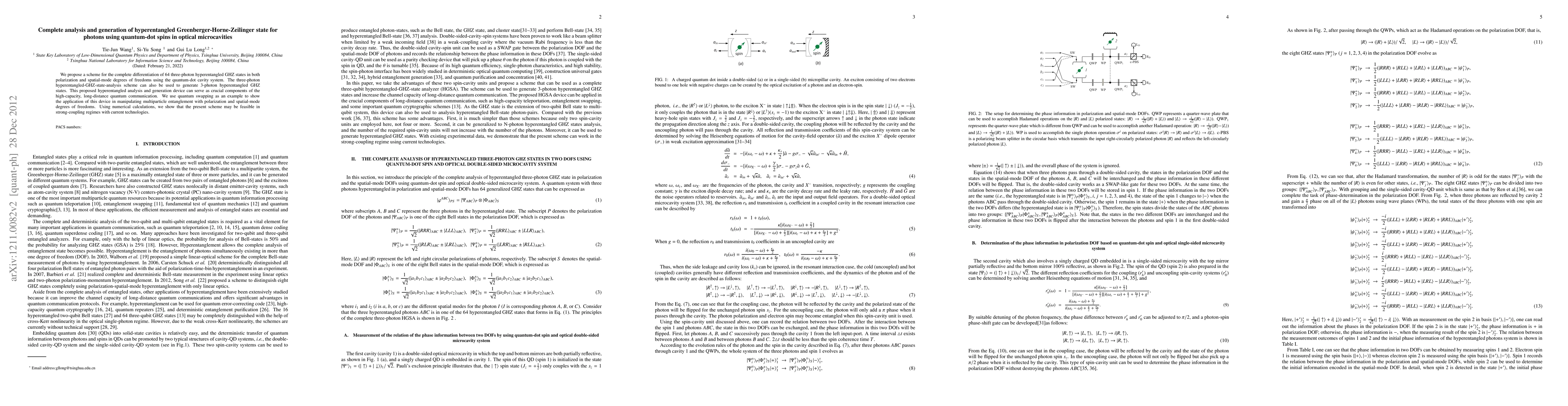 This paper proposes a method for distinguishing and generating 64 three-photon hyperentangled Greenberger-Horne-Zeilinger (GHZ) states using quantum-dot spins in optical microcavities. The scheme leverages both polarization and spatial-mode degrees of freedom and demonstrates its potential for enhancing quantum communication capabilities.