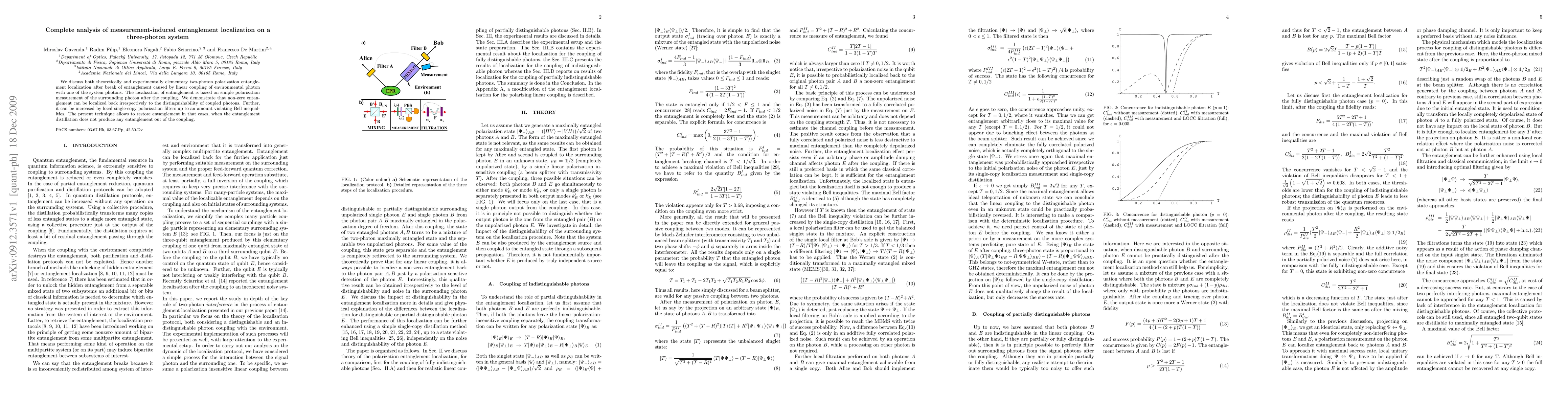 This paper presents a theoretical and experimental study on the localization of measurement-induced entanglement in a three-photon system after environmental disruption. The technique restores non-zero entanglement through polarization measurement and local filters, even when traditional distillation fails.