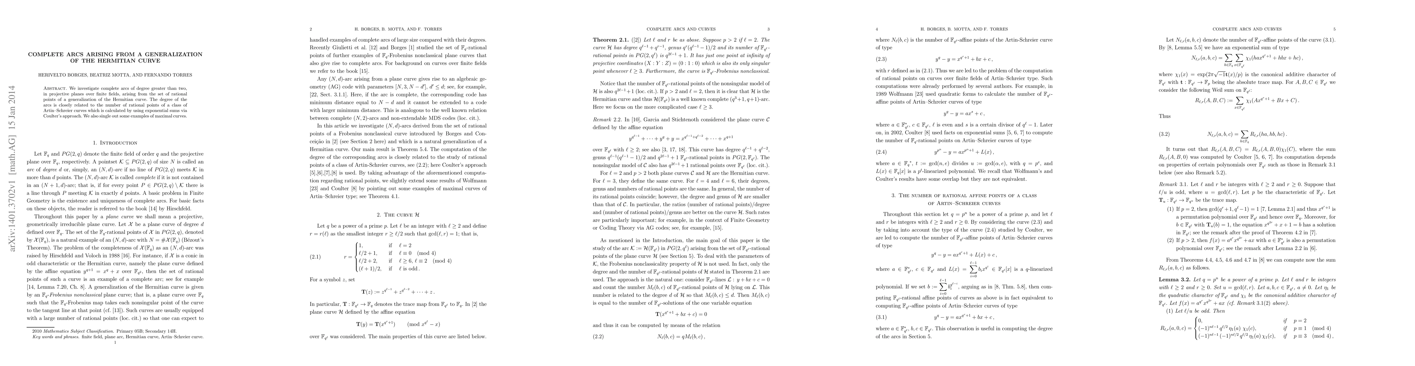 Summary: This paper explores complete arcs in projective planes over finite fields generated by rational points of a generalized Hermitian curve, correlating their degree with Artin-Schreier curves' rational points calculated via exponential sums, and identifies examples of maximal curves.