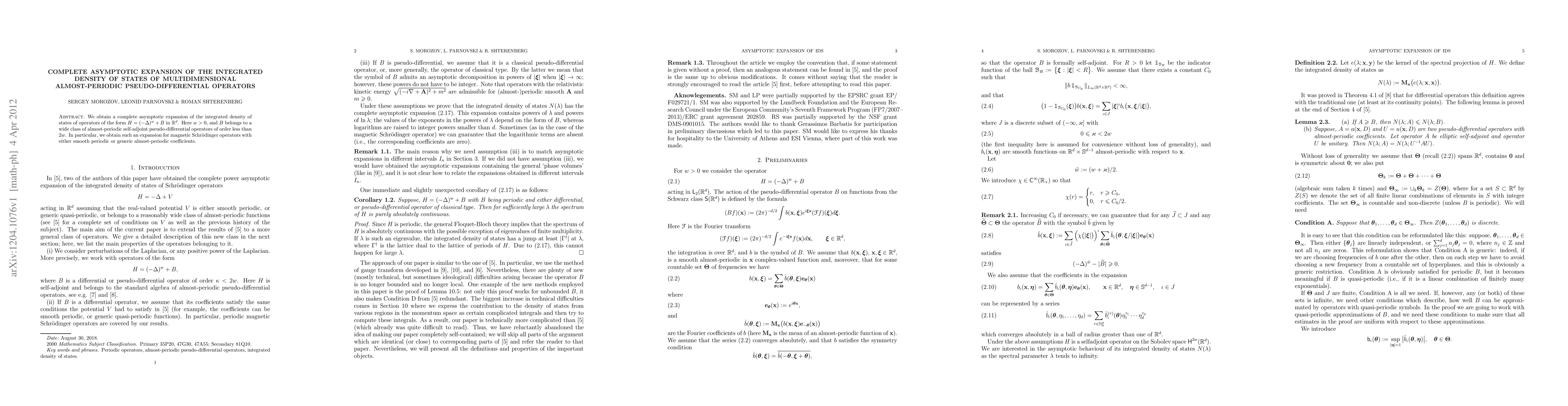 This paper provides a complete asymptotic expansion for the integrated density of states of multidimensional almost-periodic pseudo-differential operators, specifically for operators of the form H =(-\Delta)^w +B in R^d, where B is an almost-periodic self-adjoint pseudo-differential operator. The results also apply to magnetic Schrödinger operators with smooth periodic or generic almost-periodic coefficients.