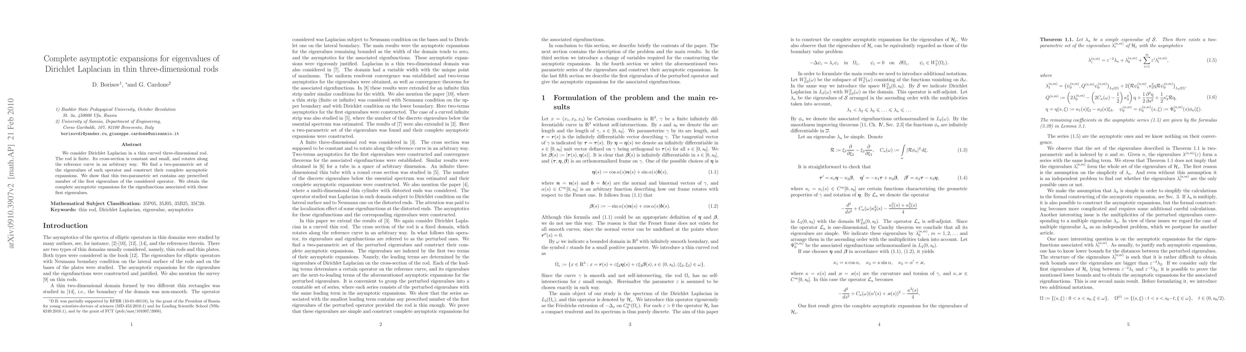 The paper presents a detailed method for deriving complete asymptotic expansions for eigenvalues and eigenfunctions of the Dirichlet Laplacian in thin three-dimensional rods, showcasing a sophisticated application of asymptotic analysis techniques.