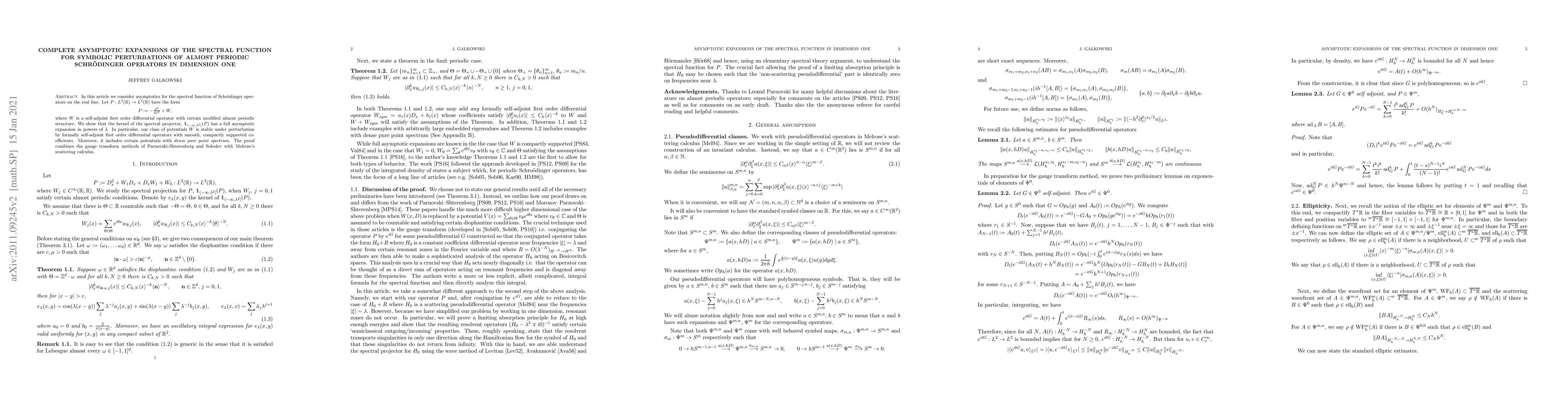 In this article we consider asymptotics for the spectral function of Schr\"odinger operators on the real line. Let $P:L^2(\mathbb{R})\to L^2(\mathbb{R})$ have the form $$ P:=-\tfrac{d^2}{dx^2}+W, $$ where $W$ is a self-adjoint first order differential operator with certain modified almost periodic structure. We show that the kernel of the spectral projector, $\mathbb{1}_{(-\infty,\lambda^2]}(P)$ has a full asymptotic expansion in powers of $\lambda$. In particular, our class of potentials $W$ is stable under perturbation by formally self-adjoint first order differential operators with smooth, compactly supported coefficients. Moreover, it includes certain potentials with dense pure point spectrum. The proof combines the gauge transform methods of Parnovski-Shterenberg and Sobolev with Melrose's scattering calculus.
