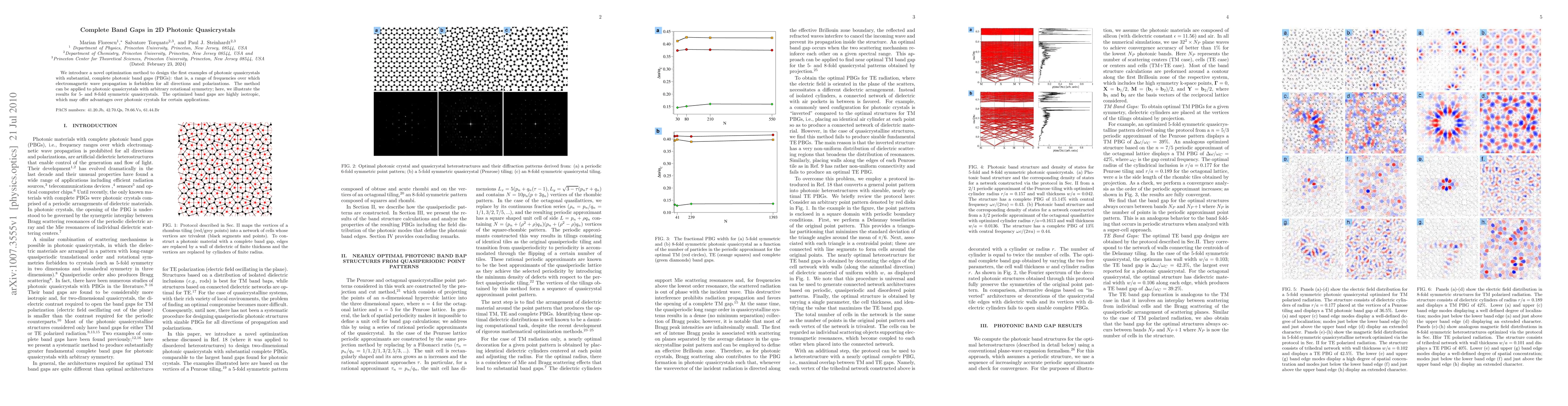 This paper presents an optimization technique to design 2D photonic quasicrystals with complete photonic band gaps, applicable to quasicrystals of any rotational symmetry, demonstrating isotropic band gaps in 5- and 8-fold symmetric examples, potentially offering advantages over traditional photonic crystals.