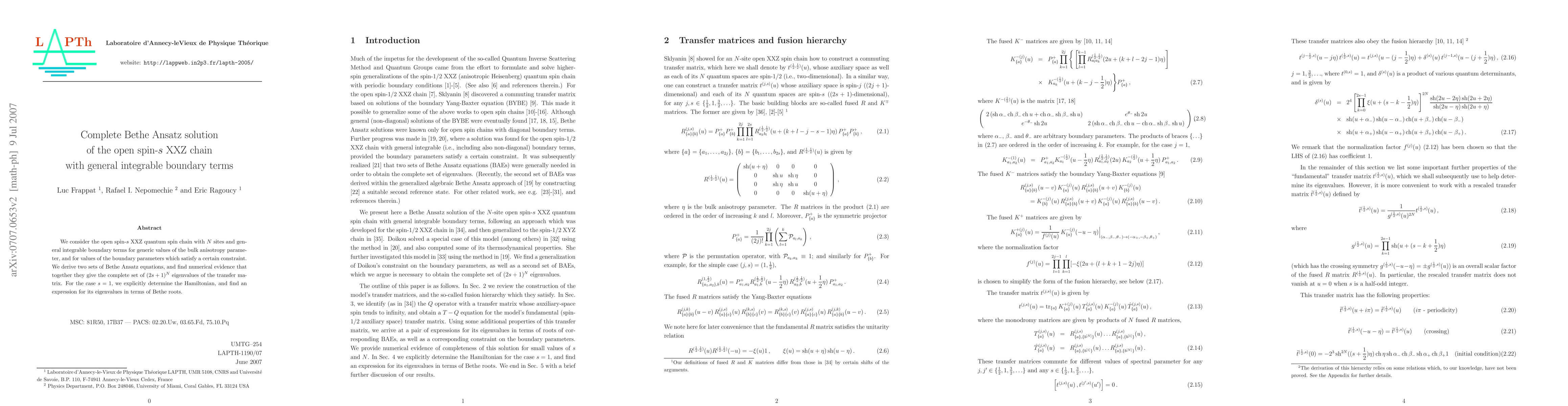 This paper presents a complete Bethe Ansatz solution for the open spin-s XXZ quantum spin chain with general integrable boundary terms, deriving two sets of Bethe Ansatz equations that numerically yield the complete set of eigenvalues for the transfer matrix. For s=1, it explicitly determines the Hamiltonian and provides an expression for its eigenvalues in terms of Bethe roots.