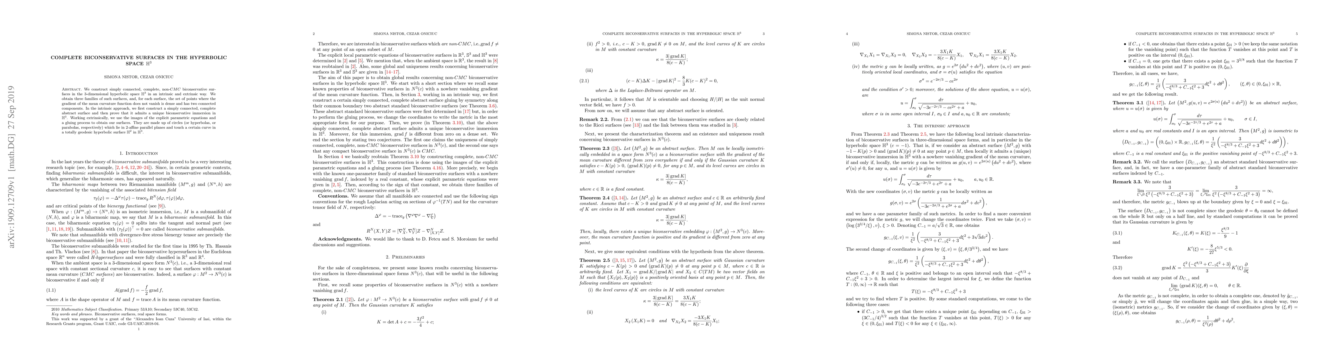 We construct simply connected, complete, non-$CMC$ biconservative surfaces in the $3$-dimensional hyperbolic space $\mathbb{H}^3$ in an intrinsic and extrinsic way. We obtain three families of such surfaces, and, for each surface, the set of points where the gradient of the mean curvature function does not vanish is dense and has two connected components. In the intrinsic approach, we first construct a simply connected, complete abstract surface and then prove that it admits a unique biconservative immersion in $\mathbb{H}^3$. Working extrinsically, we use the images of the explicit parametric equations and a gluing process to obtain our surfaces. They are made up of circles (or hyperbolas, or parabolas, respectively) which lie in $2$-affine parallel planes and touch a certain curve in a totally geodesic hyperbolic surface $\mathbb{H}^2$ in $\mathbb{H}^3$.