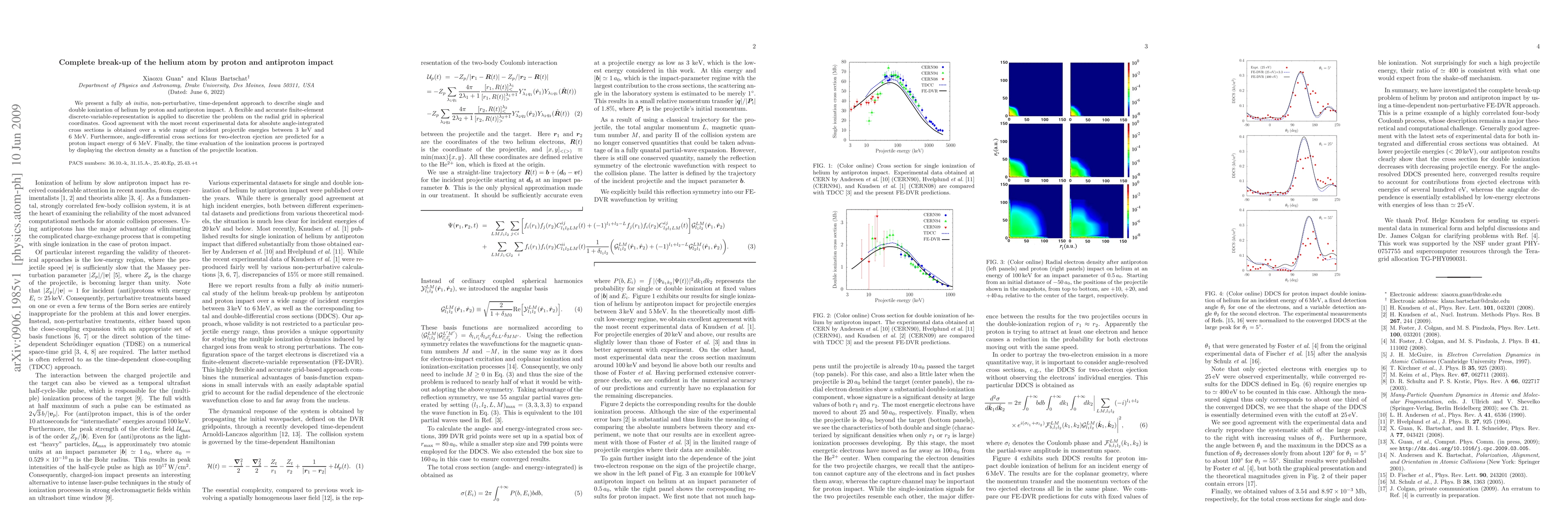 This paper presents an ab initio method for describing helium atom ionization by proton and antiproton impacts, achieving good agreement with experimental data. It predicts angle-differential cross sections for two-electron ejection and visualizes the ionization process over varying projectile energies.