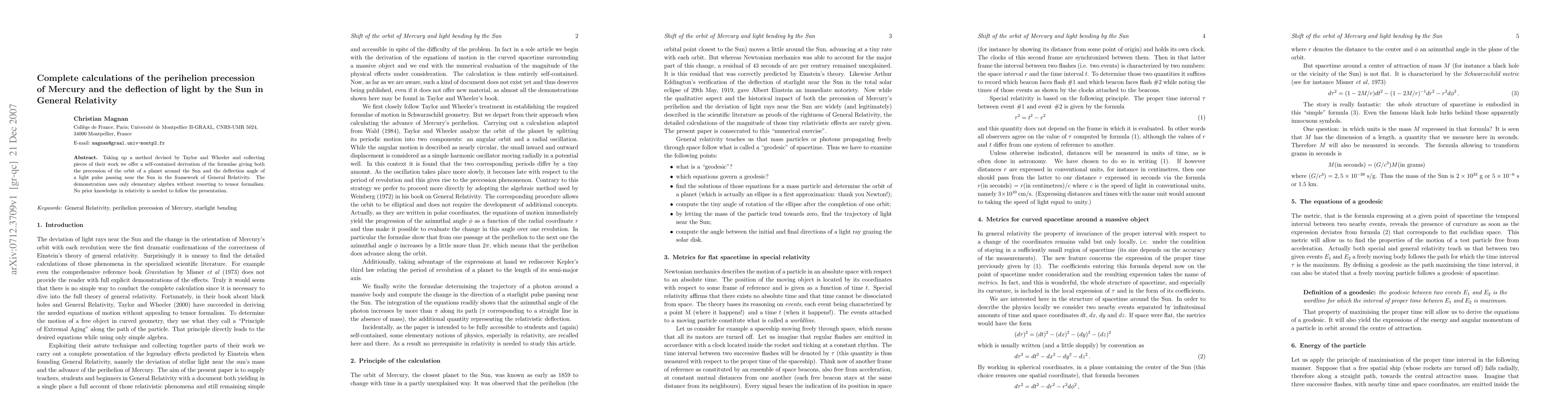 Taking up a method devised by Taylor and Wheeler and collecting pieces of their work we offer a self-contained derivation of the formulae giving both the precession of the orbit of a planet around the Sun and the deflection angle of a light pulse passing near the Sun in the framework of General Relativity. The demonstration uses only elementary algebra without resorting to tensor formalism. No prior knowledge in relativity is needed to follow the presentation.
