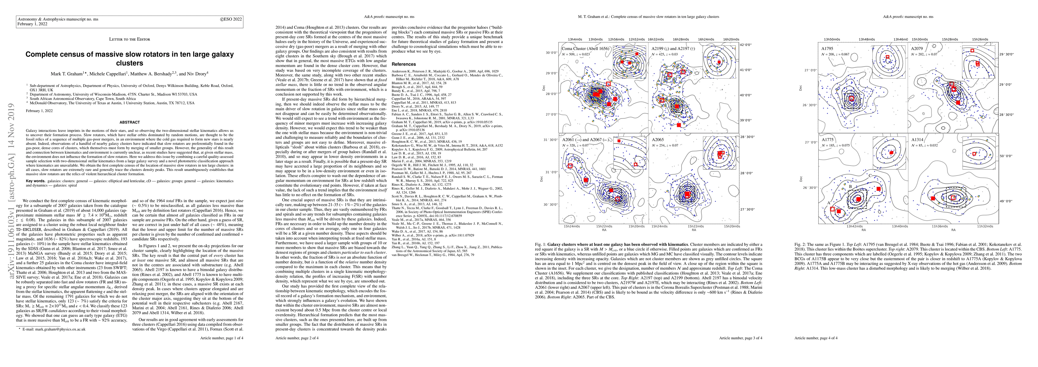This study provides the first complete census of massive slow rotators in ten large galaxy clusters, revealing that slow rotators are rare and predominantly found in the dense cluster cores, supporting the theory that they are remnants of hierarchical cluster formation processes. The findings clarify the relationship between stellar kinematics and cluster environment, confirming the role of gas-poor mergers in their formation.