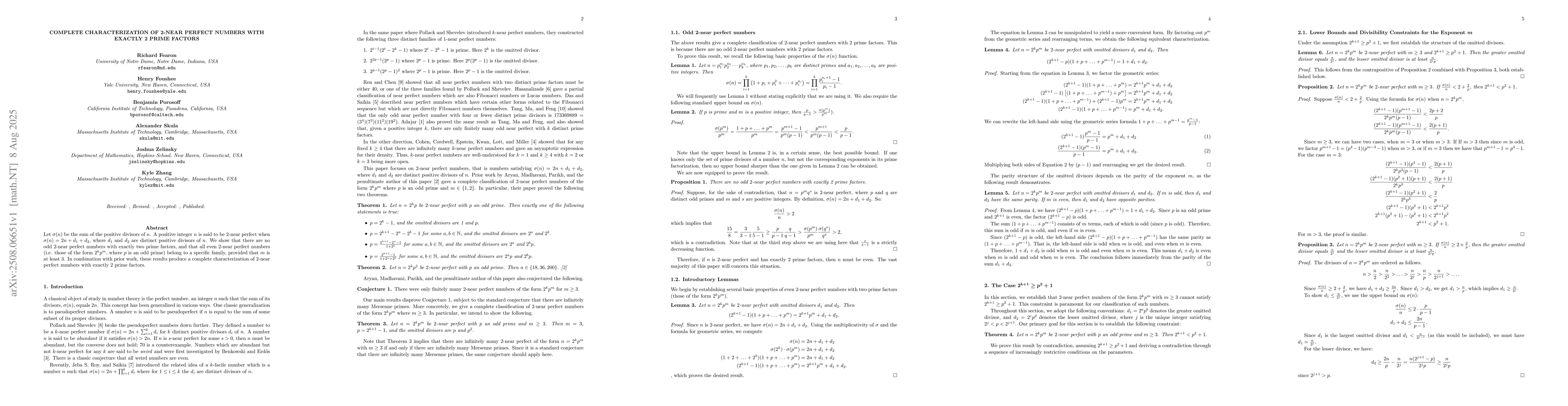 Let $\sigma(n)$ be the sum of the positive divisors of $n$. A positive integer $n$ is said to be $2$-near perfect when $\sigma(n)=2n+d_1+d_2$, where $d_1$ and $d_2$ are distinct positive divisors of $n$. We show that there are no odd $2$-near perfect numbers with exactly two prime factors, and that all even $2$-near perfect numbers (i.e. those of the form $2^kp^m$, where $p$ is an odd prime) belong to a specific family, provided that $m$ is at least 3. In combination with prior work, these results produce a complete characterization of $2$-near perfect numbers with exactly 2 prime factors.