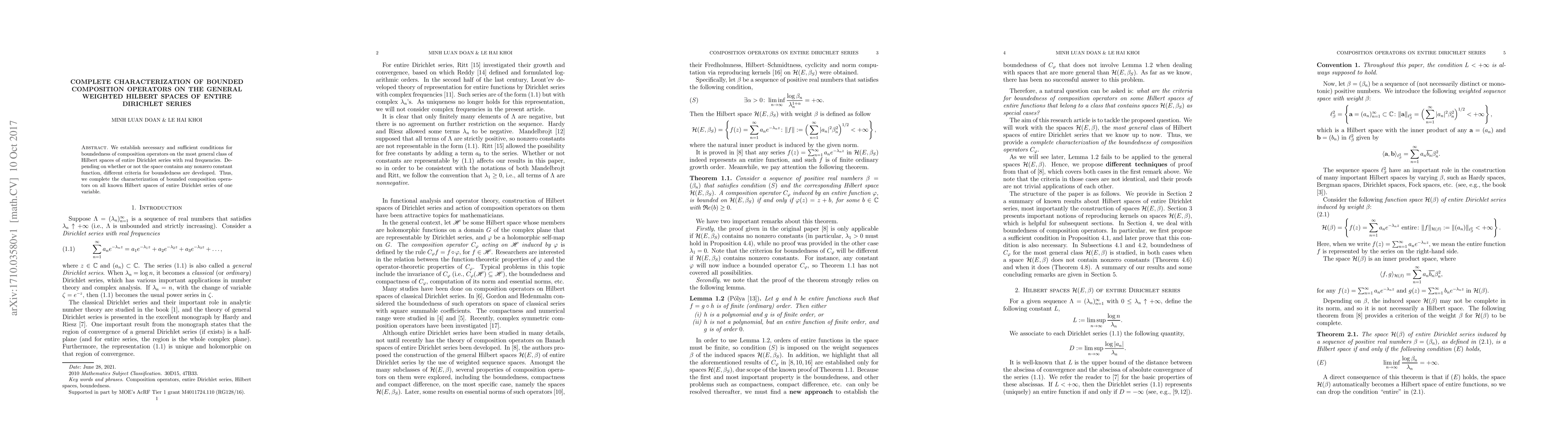This paper provides necessary and sufficient conditions for the boundedness of composition operators on the general weighted Hilbert spaces of entire Dirichlet series, distinguishing criteria based on the presence or absence of nonzero constant functions. It completes the characterization of bounded composition operators for all relevant Hilbert spaces.