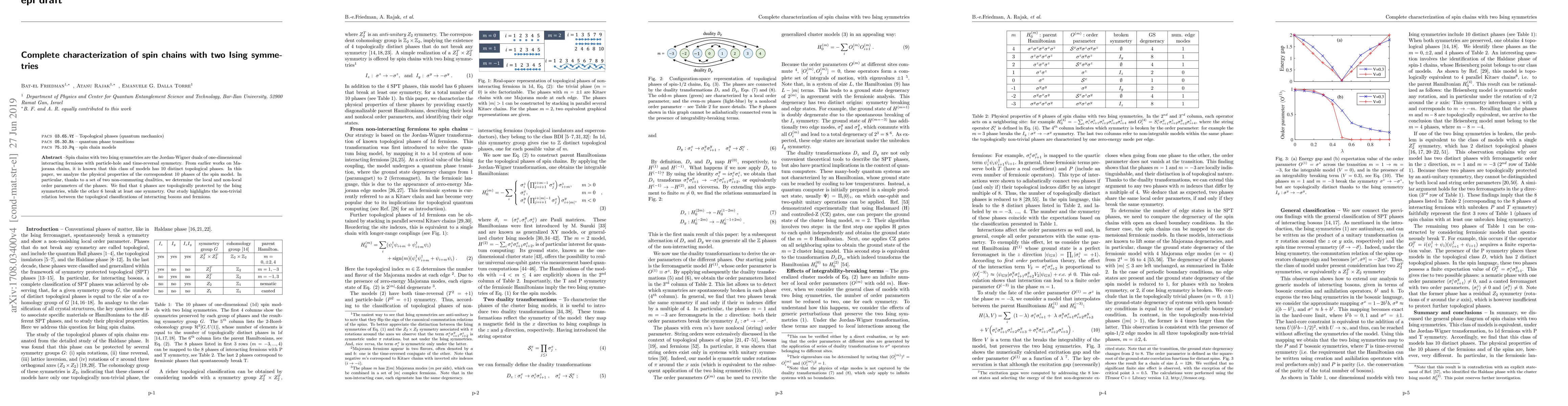 This paper characterizes the 10 topological phases of spin chains with two Ising symmetries, revealing that 4 phases are topologically protected by these symmetries while the others break at least one. The study employs dualities to determine local and non-local order parameters, highlighting the connection between topological classifications of fermions and bosons.
