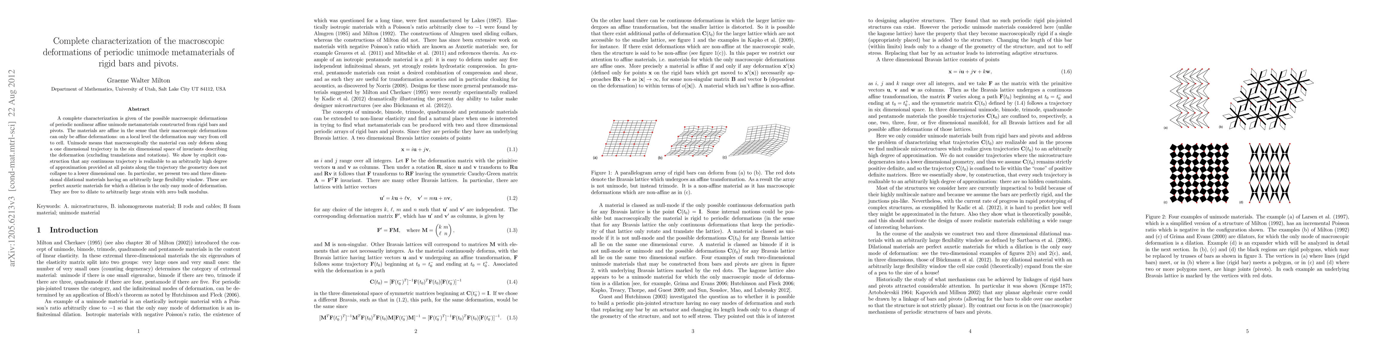 A complete characterization is given of the possible macroscopic deformations of periodic nonlinear affine unimode metamaterials constructed from rigid bars and pivots. The materials are affine in the sense that their macroscopic deformations can only be affine deformations: on a local level the deformation may vary from cell to cell. Unimode means that macroscopically the material can only deform along a one dimensional trajectory in the six dimensional space of invariants describing the deformation (excluding translations and rotations). We show by explicit construction that any continuous trajectory is realizable to an arbitrarily high degree of approximation provided at all points along the trajectory the geometry does not collapse to a lower dimensional one. In particular, we present two and three dimensional dilational materials having an arbitrarily large flexibility window. These are perfect auxetic materials for which a dilation is the only easy mode of deformation. They are free to dilate to arbitrarily large strain with zero bulk modulus.