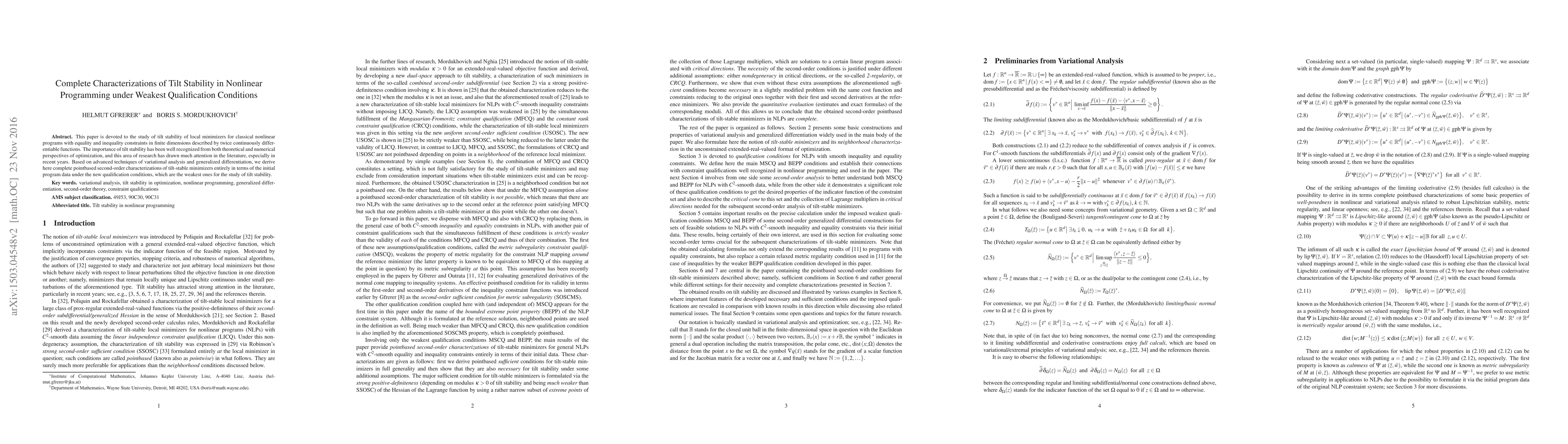 The paper introduces novel characterizations of tilt stability using variational analysis and generalized differentiation, under the weakest qualification conditions, providing a comprehensive framework for understanding minimizer stability in nonlinear programming.