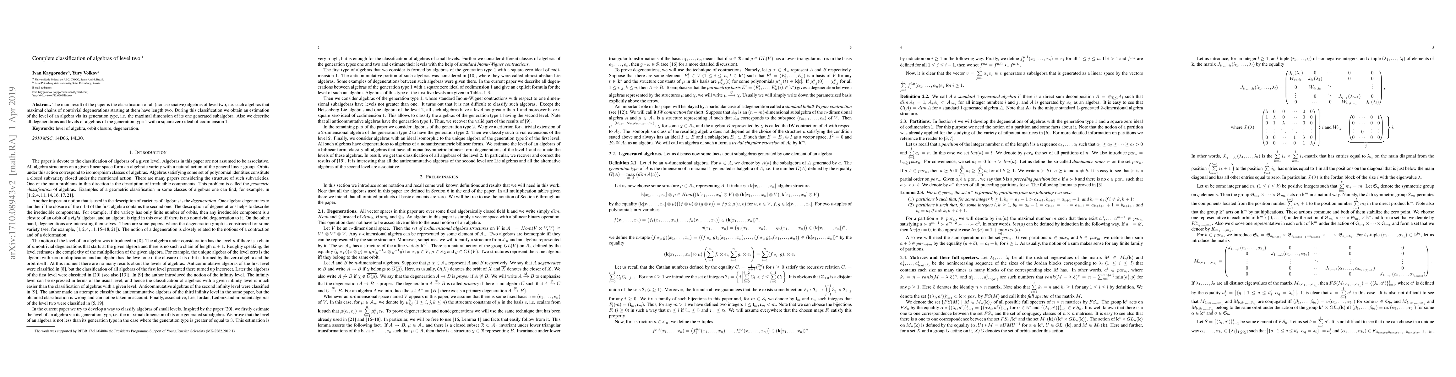 The main result of the paper is the classification of all (nonassociative) algebras of level two, i.e. such algebras that maximal chains of nontrivial degenerations starting at them have length two. During this classification we obtain an estimation of the level of an algebra via its generation type, i.e. the maximal dimension of its one generated subalgebra. Also we describe all degenerations and levels of algebras of the generation type $1$ with a square zero ideal of codimension $1$.