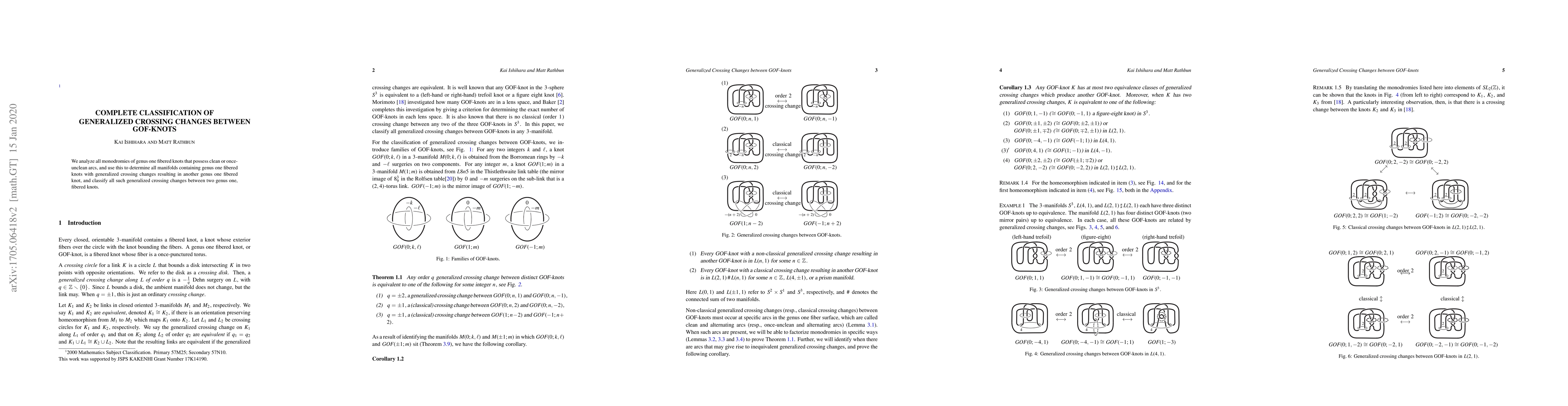 This study classifies all generalized crossing changes between genus one fibered knots (GOF-knots) by analyzing monodromies of knots with clean or once-unclean arcs, thereby determining the resulting manifolds and complete change processes.